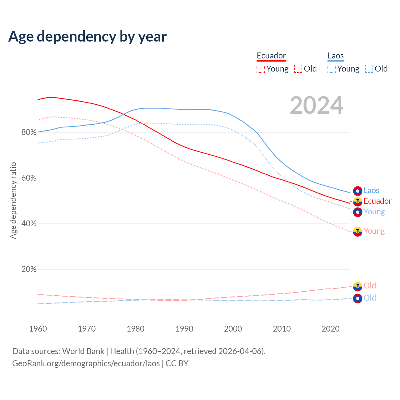 - Ecuador is ranked 105/196 by median age (oldest to youngest) vs 130/196 for Laos.