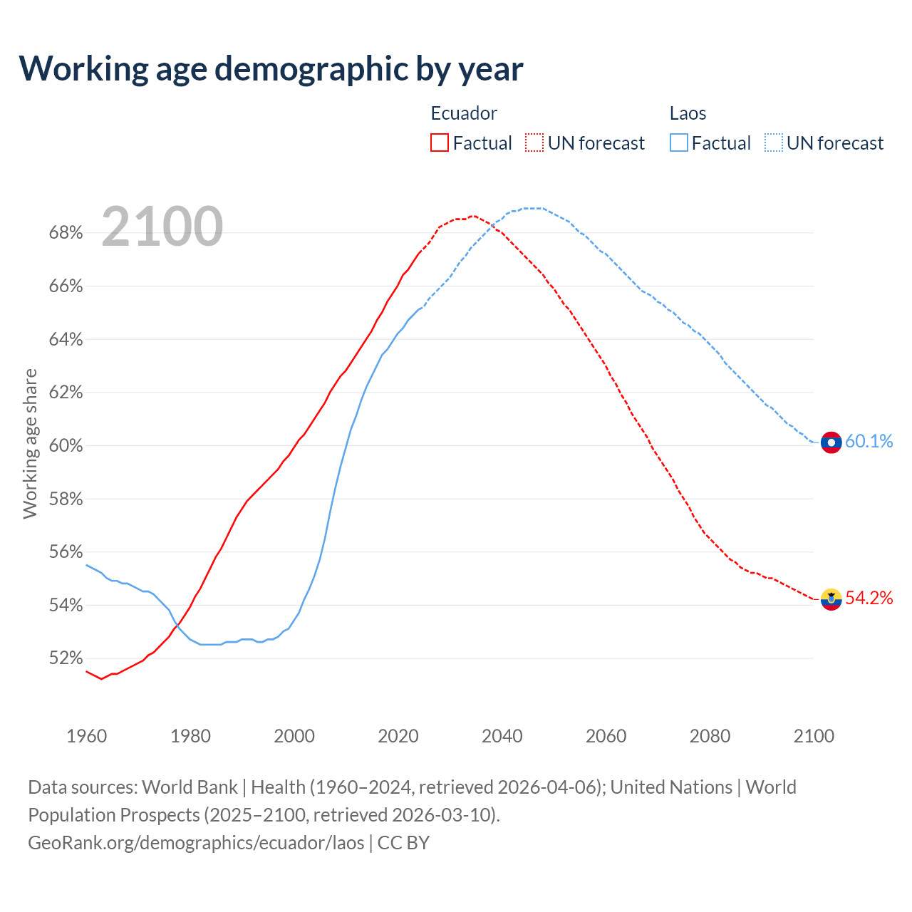 - Ecuador has 12.4M working age adults (aged 15-64) vs 5.21M in Laos.
