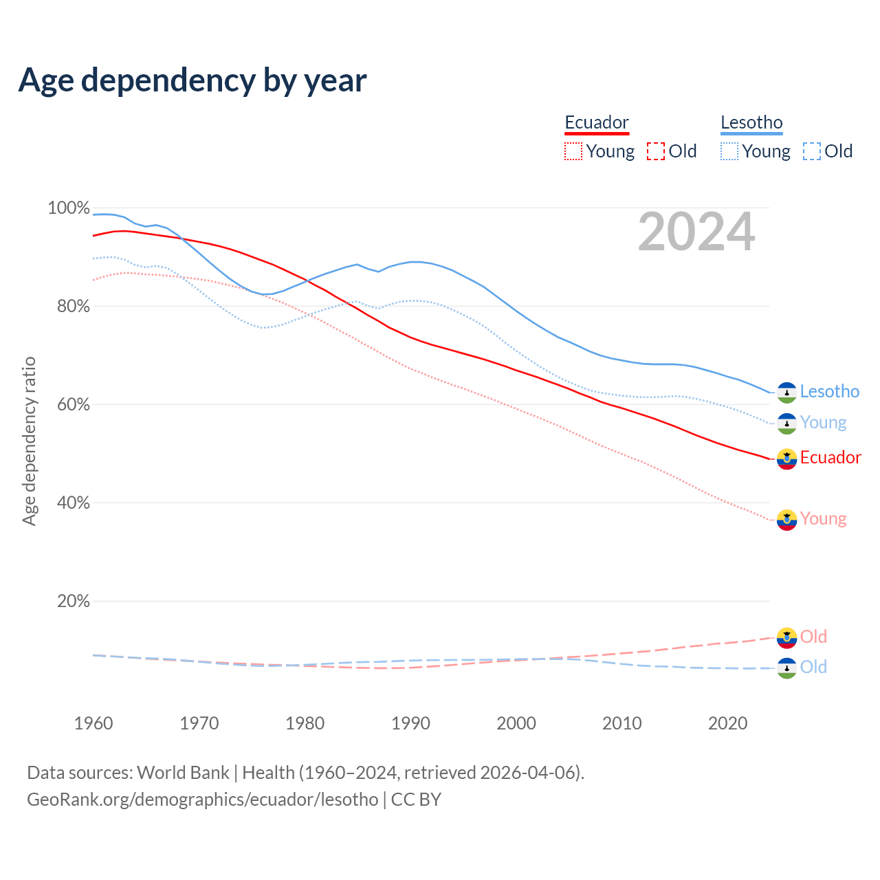 - The share of old-age demographic (65+) in Ecuador is 8.34% vs 3.86% in Lesotho.