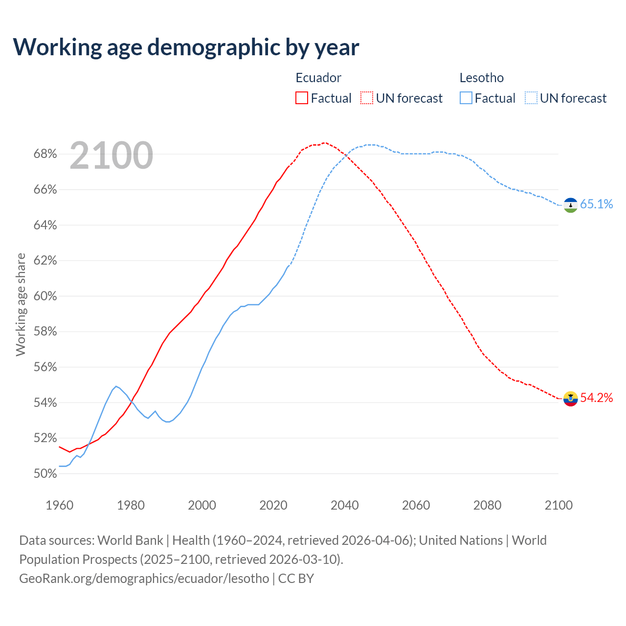 Median age Ecuador vs Lesotho, 1960-2100