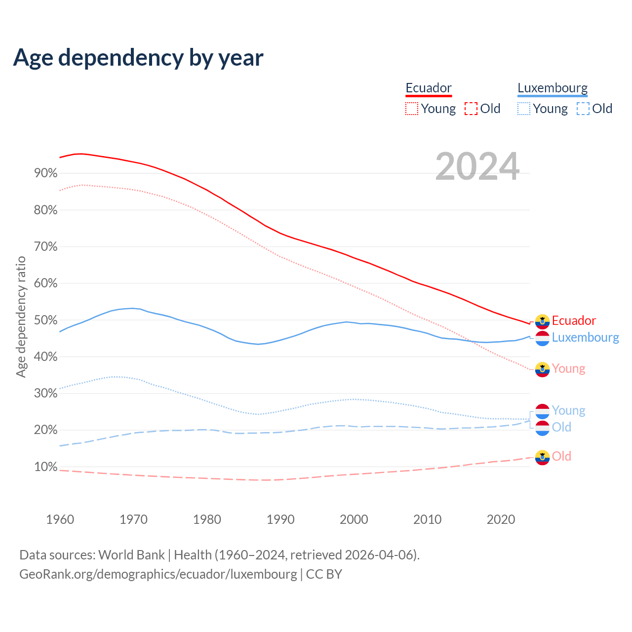 - The share of young demographic (0-15 years old) in Ecuador is 24.5% vs 15.8% in Luxembourg.