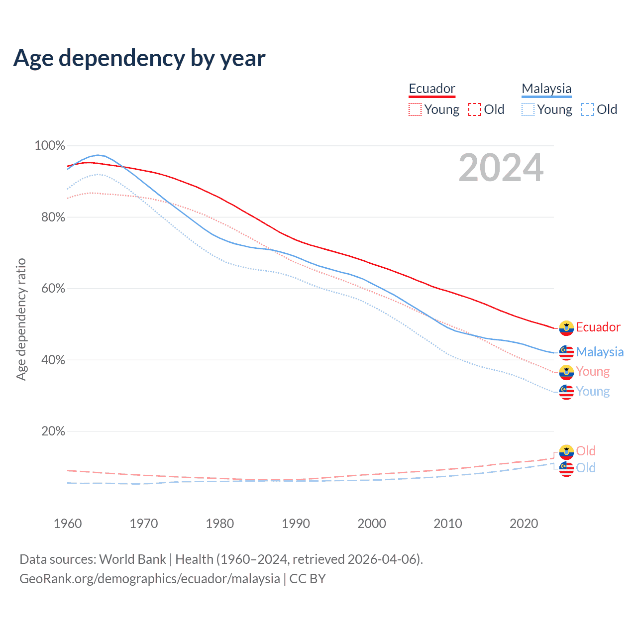Data sources: World Bank | Health (1960–2024, retrieved 2026-04-06); U.S. Census Bureau (1960–2024, retrieved 2026-02-08).