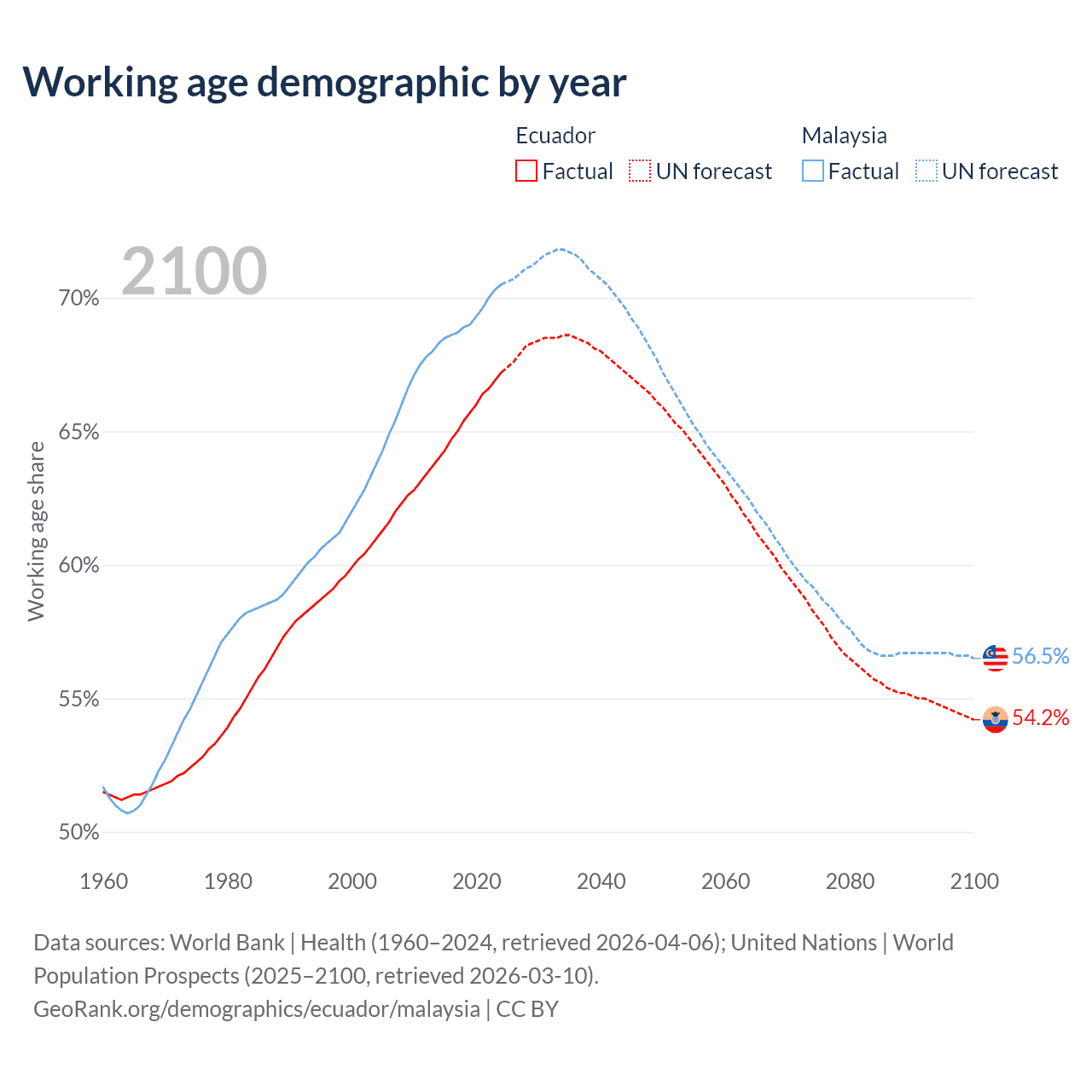 Median age Ecuador vs Malaysia, 1960-2100
