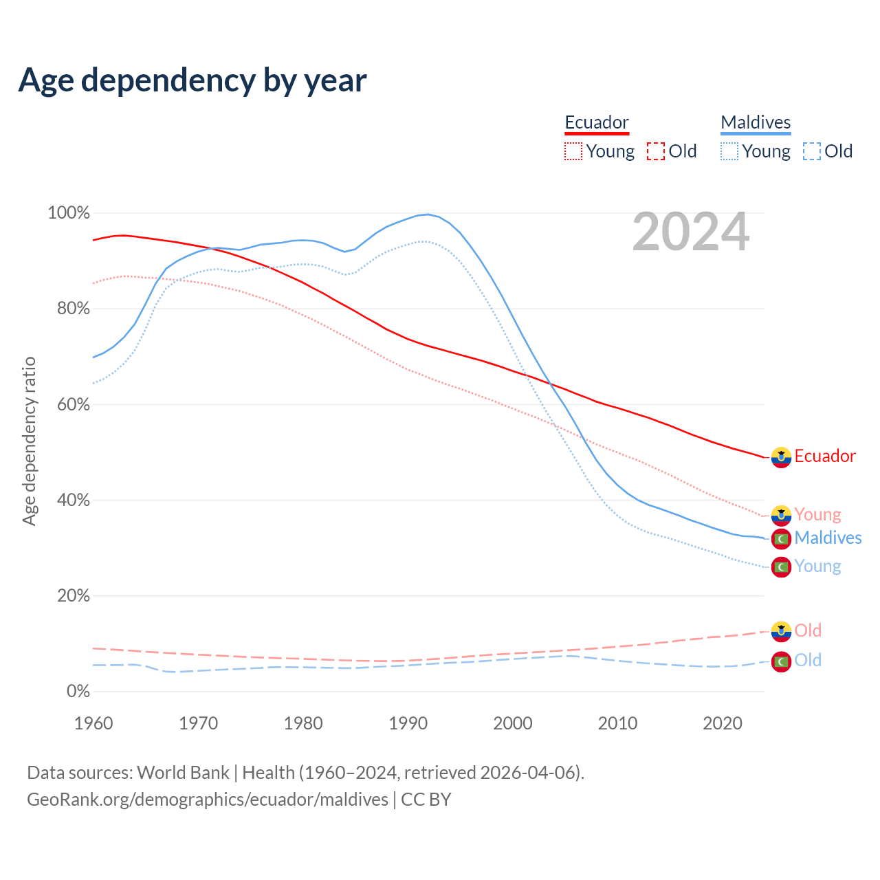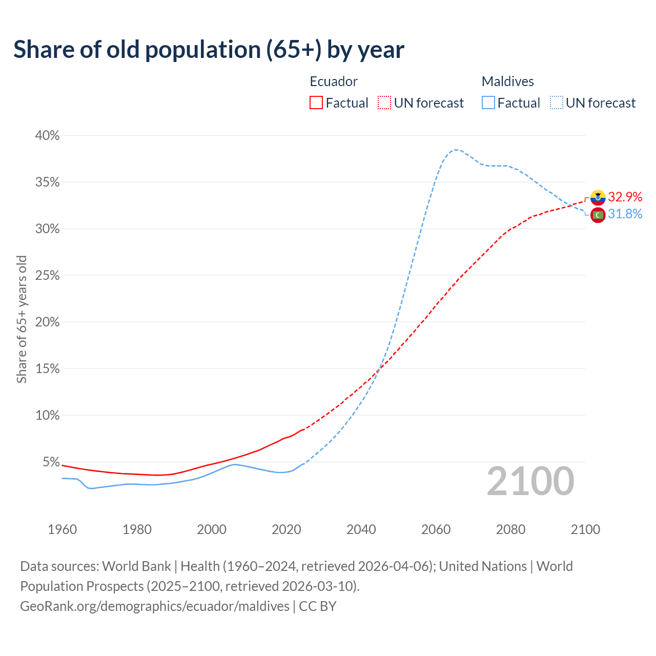- The share of old-age demographic (65+) in Ecuador is 8.34% vs 4.64% in Maldives.