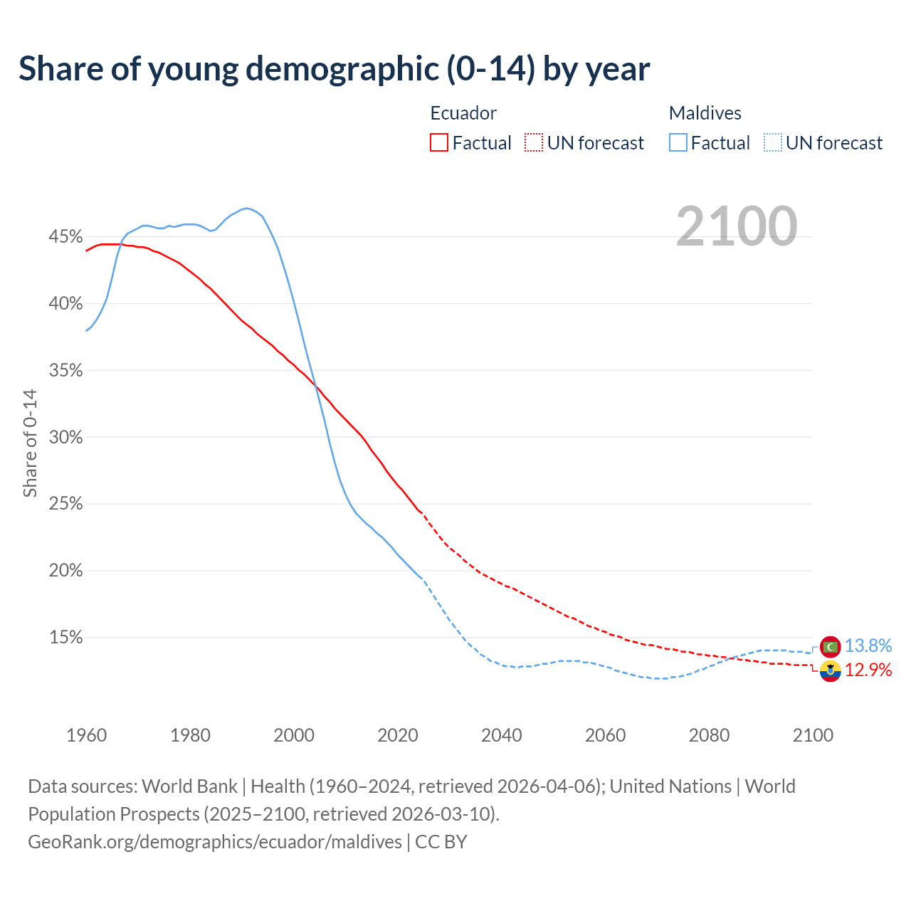 - The share of young demographic (0-15 years old) in Ecuador is 24.5% vs 19.6% in Maldives.