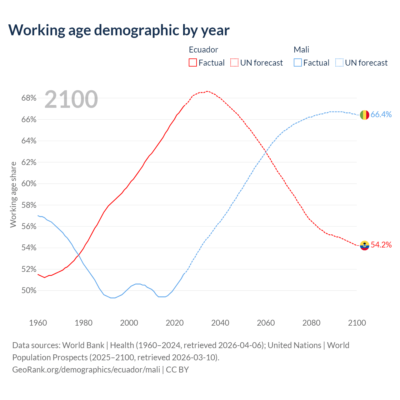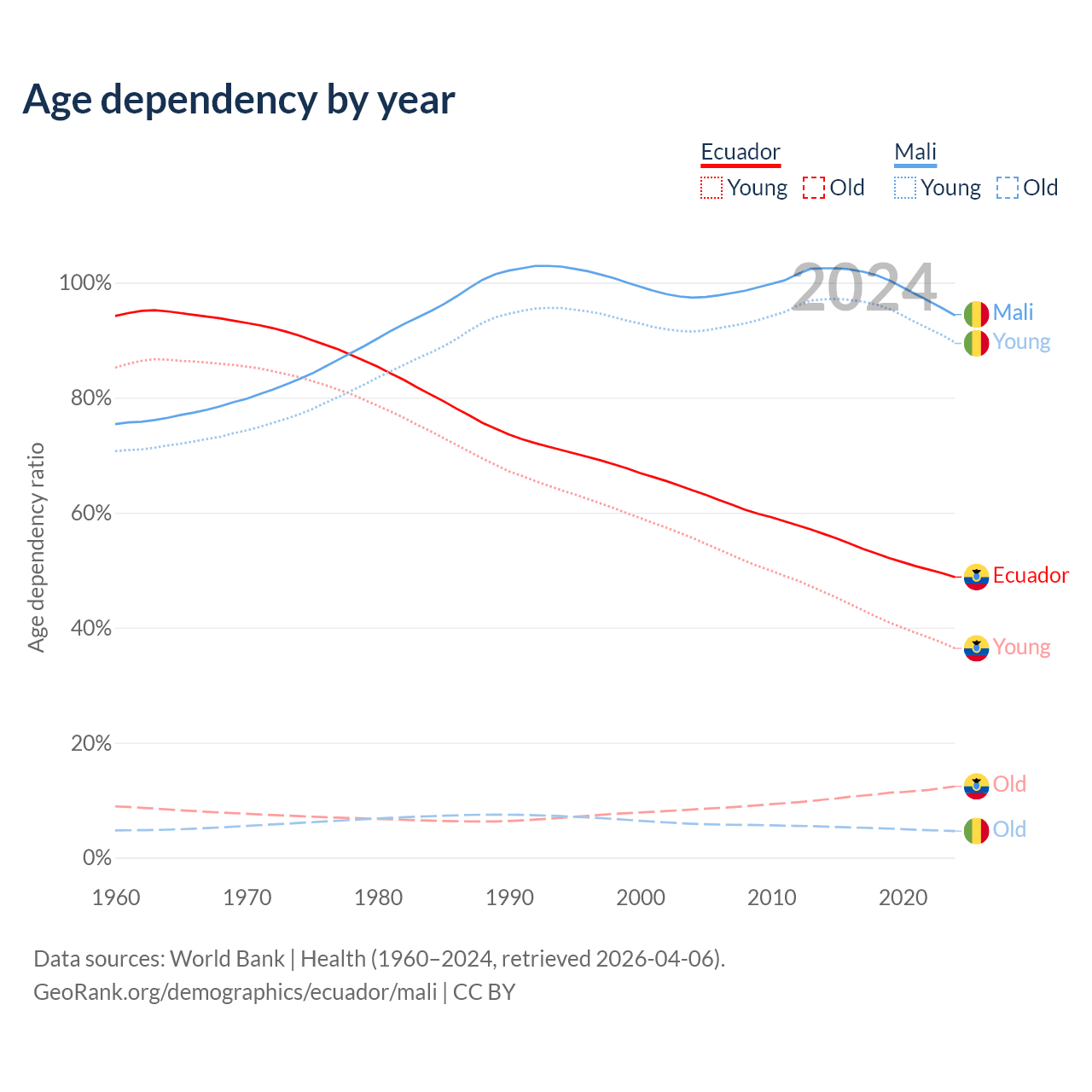 - The share of old-age demographic (65+) in Ecuador is 8.34% vs 2.38% in Mali.