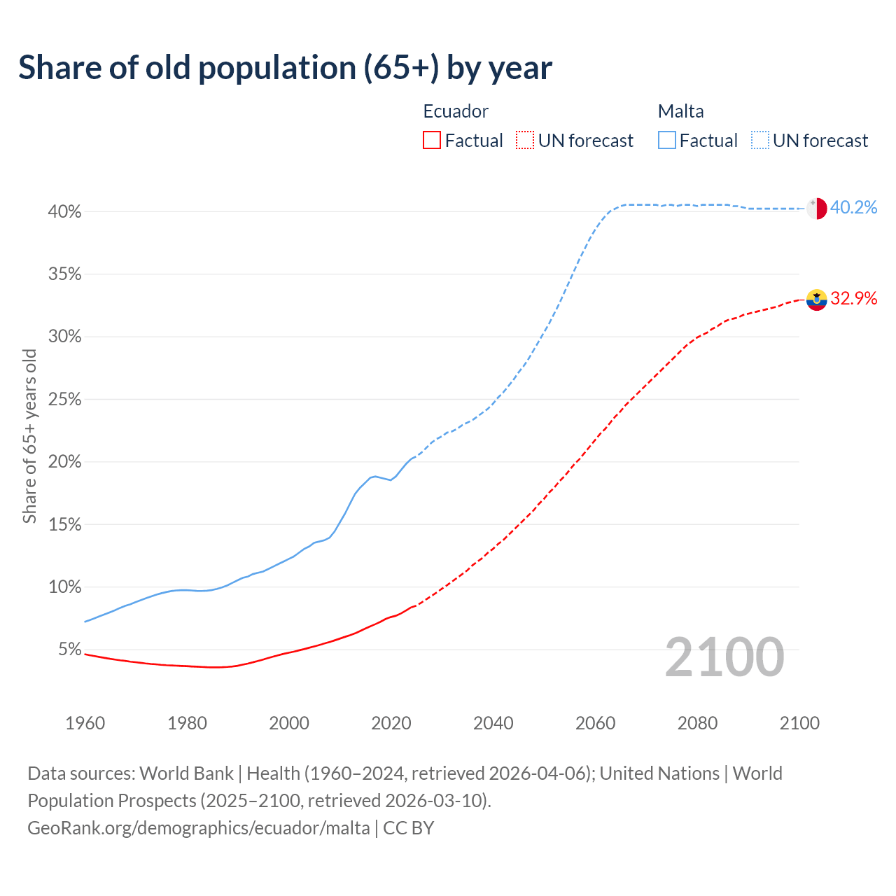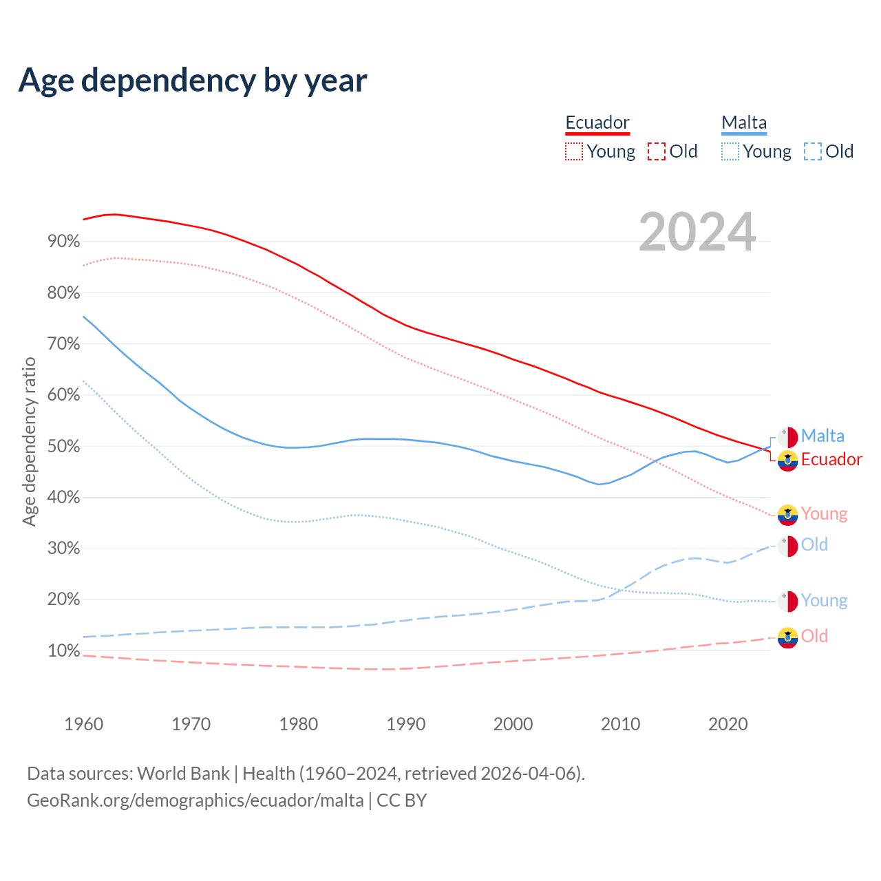- The share of old-age demographic (65+) in Ecuador is 8.34% vs 20.2% in Malta.