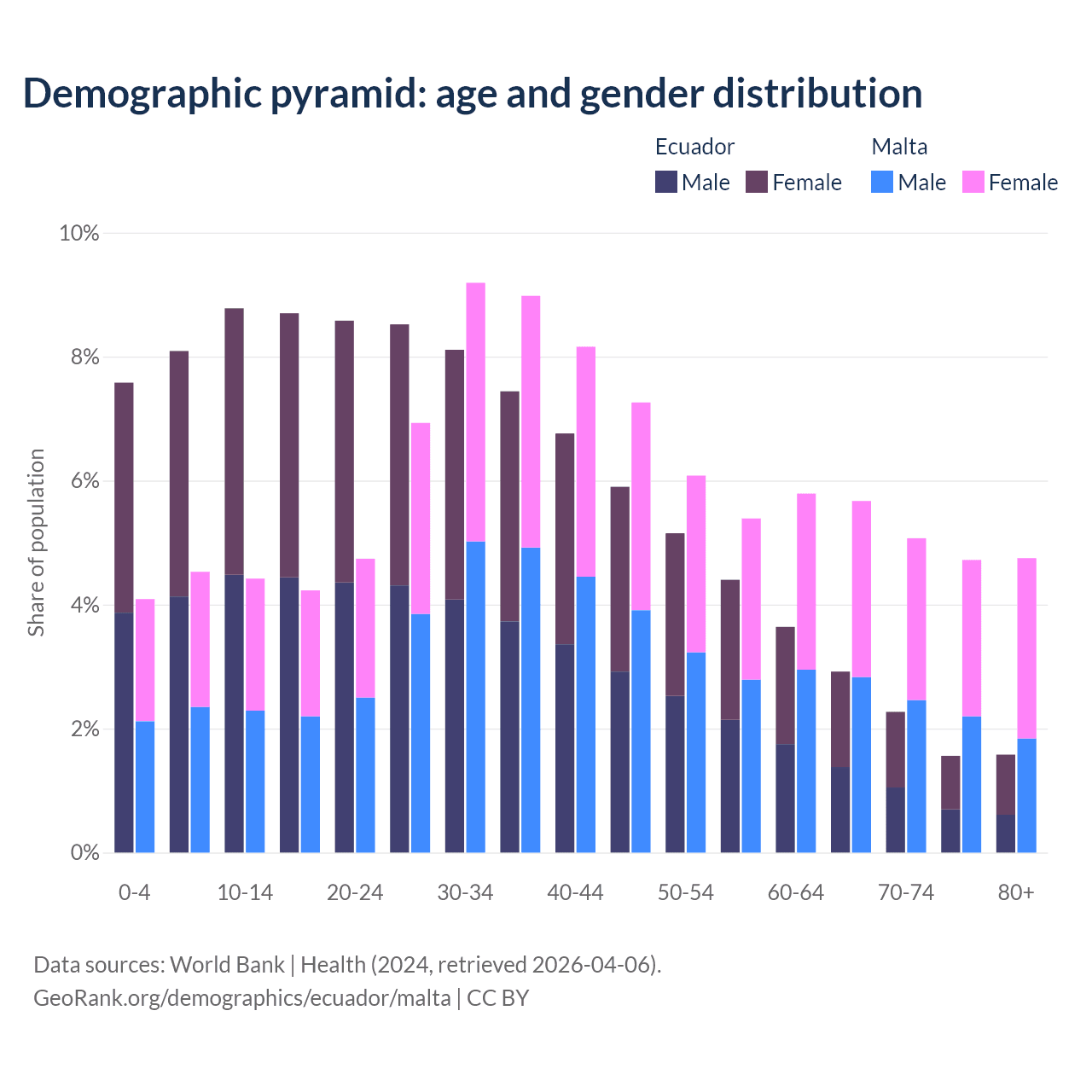 - Ecuador is ranked 105/196 by median age (oldest to youngest) vs 36/196 for Malta.