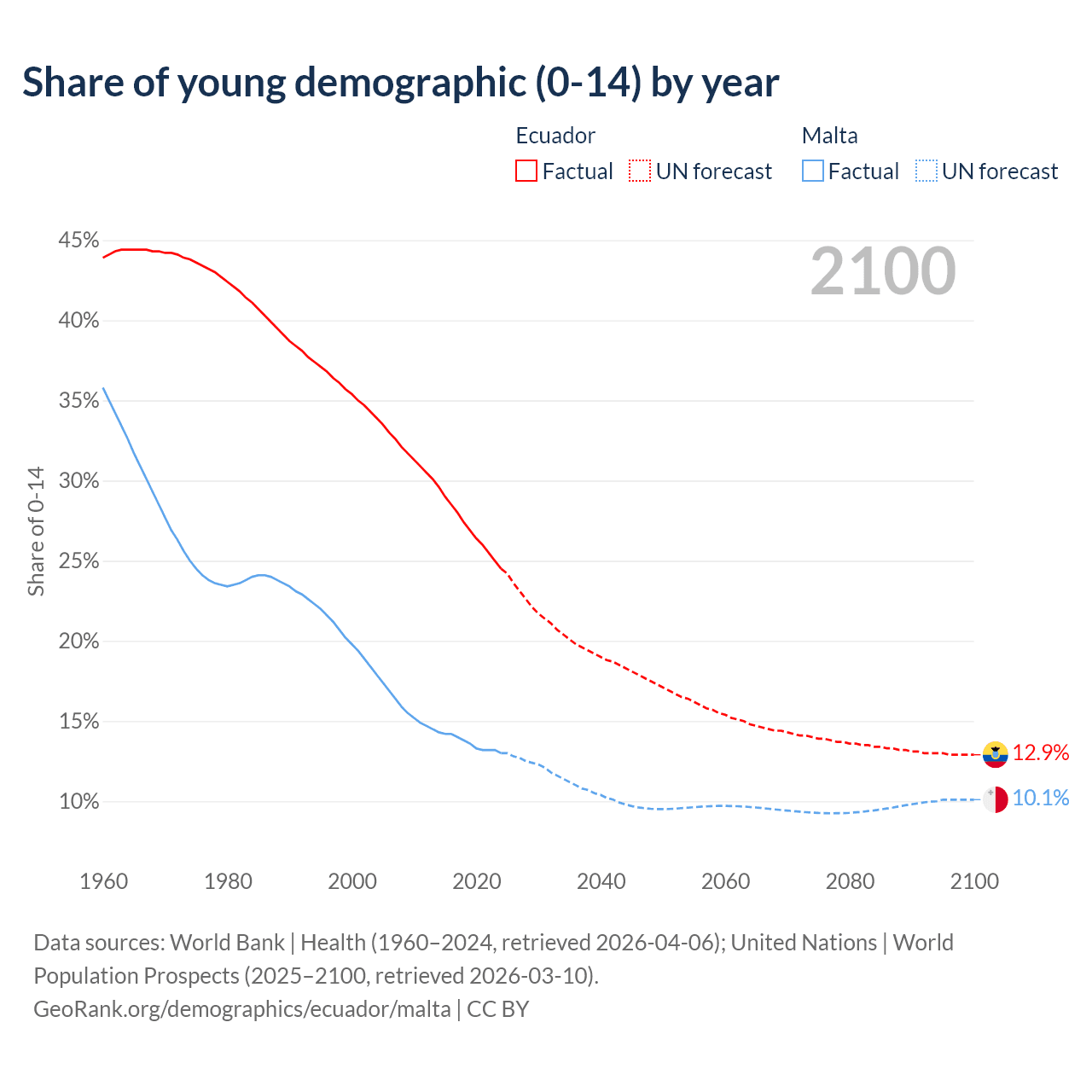 - The share of young demographic (0-15 years old) in Ecuador is 24.5% vs 13% in Malta.