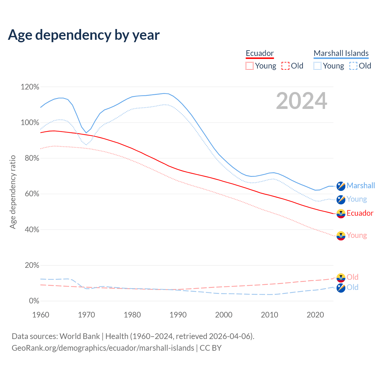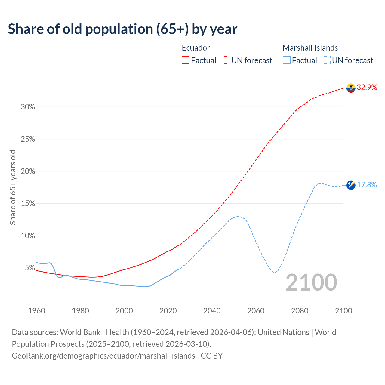 - The share of old-age demographic (65+) in Ecuador is 8.34% vs 4.64% in the Marshall Islands.