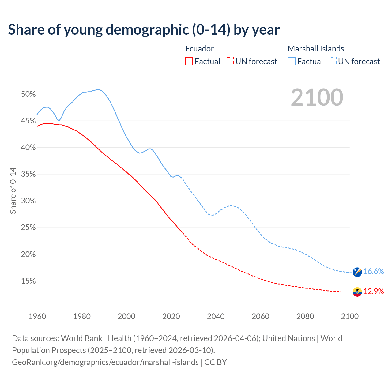 - The share of young demographic (0-15 years old) in Ecuador is 24.5% vs 34.5% in the Marshall Islands.