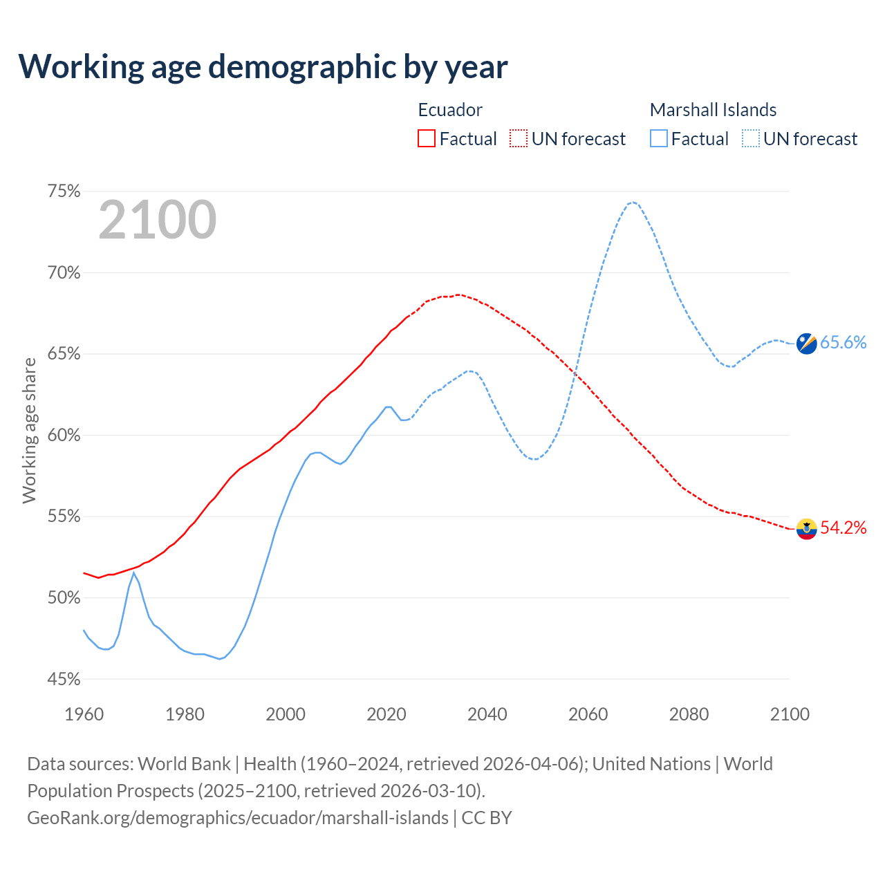 - Ecuador has 12.4M working age adults (aged 15-64) vs 21.3K in the Marshall Islands.
