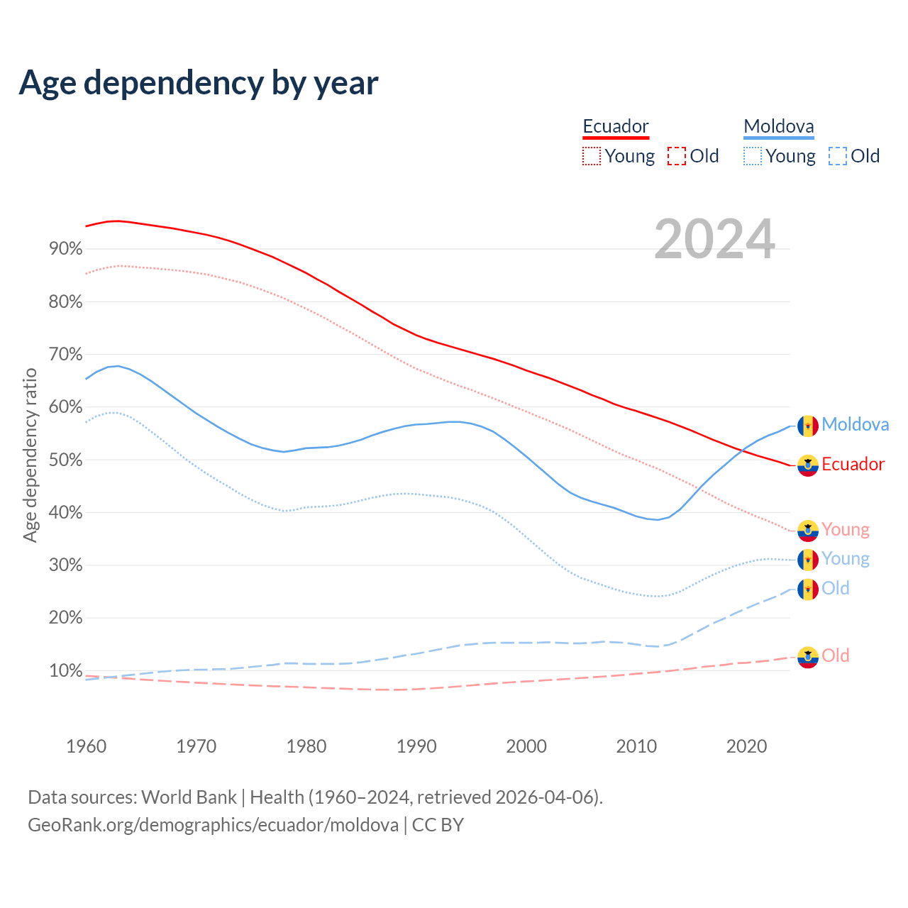 - Ecuador is ranked 105/196 by median age (oldest to youngest) vs 54/196 for Moldova.