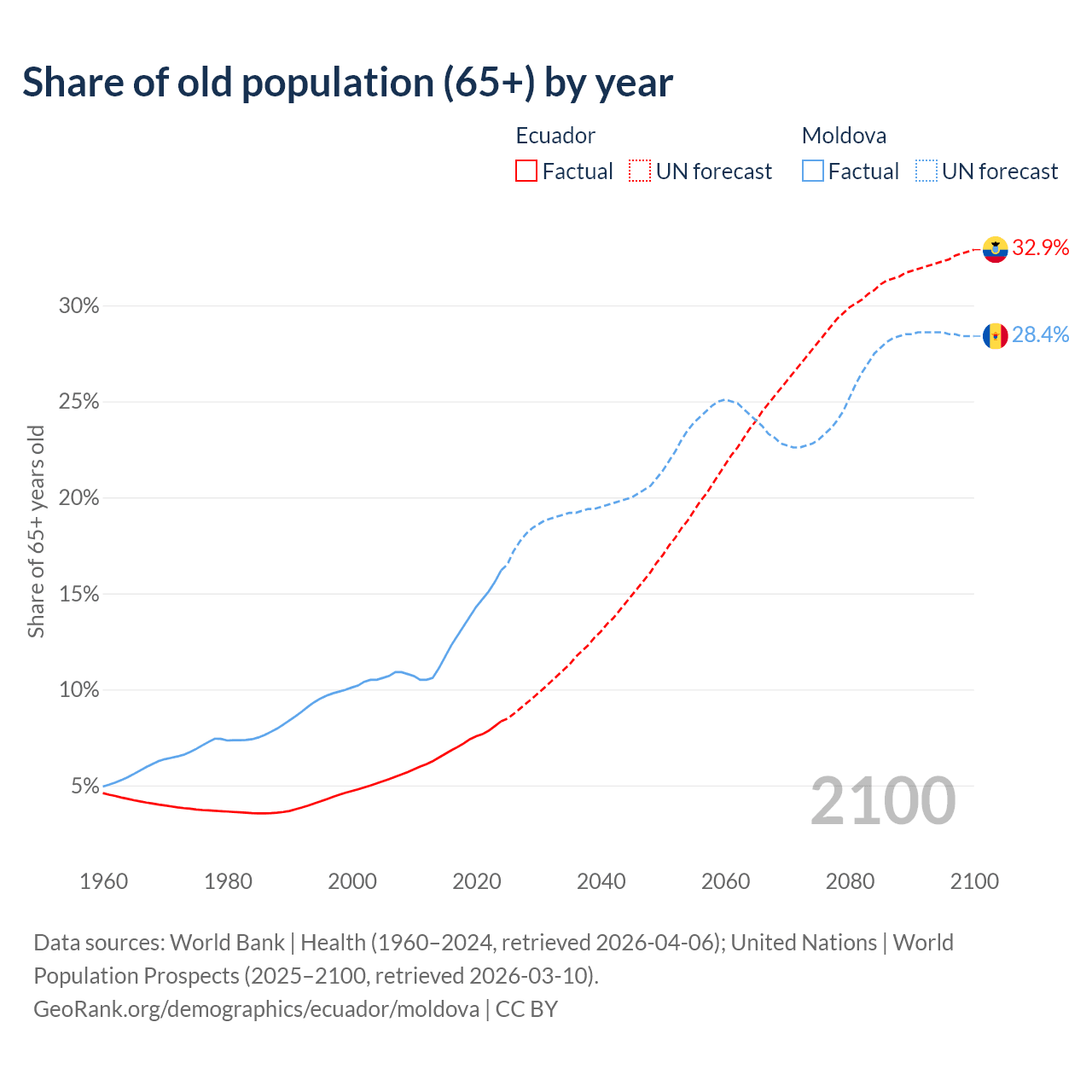 The share of older people aged 65 and over is 8.34% in Ecuador and 16.2% in Moldova. Life expectancy in Ecuador compared to Moldova .