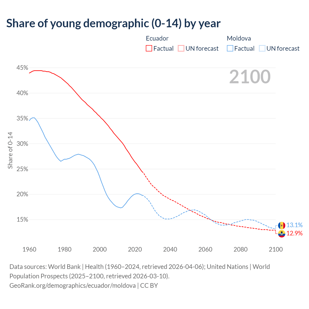- The share of young demographic (0-15 years old) in Ecuador is 24.5% vs 19.8% in Moldova.