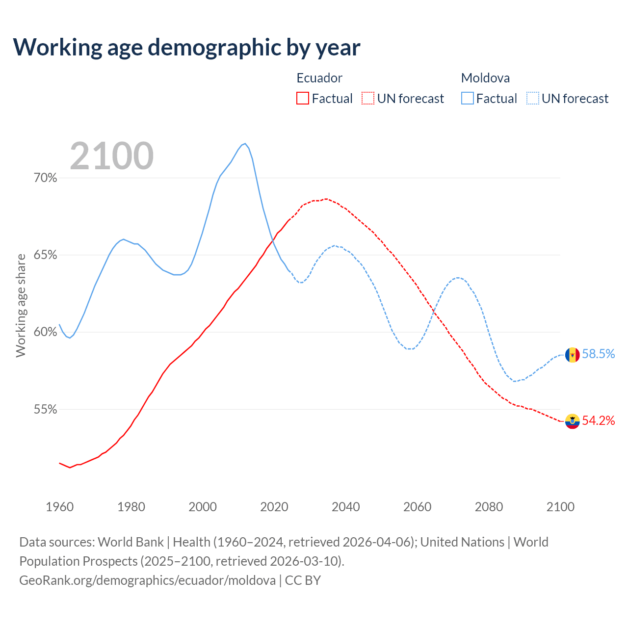 Median age Ecuador vs Moldova, 1960-2100