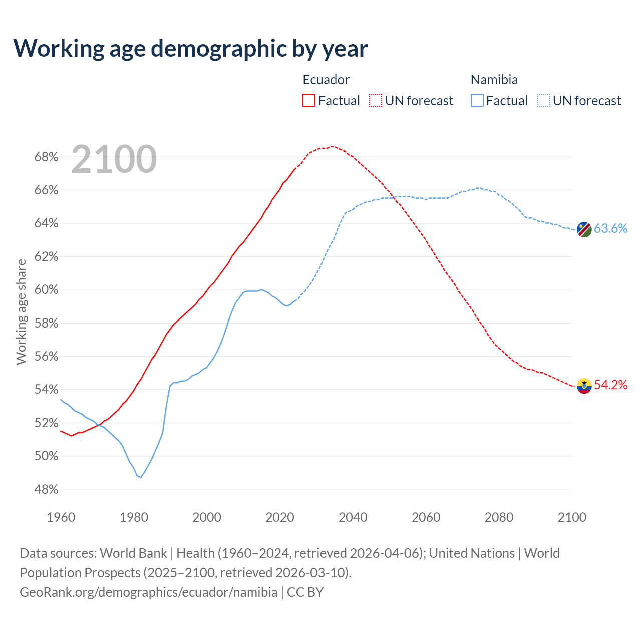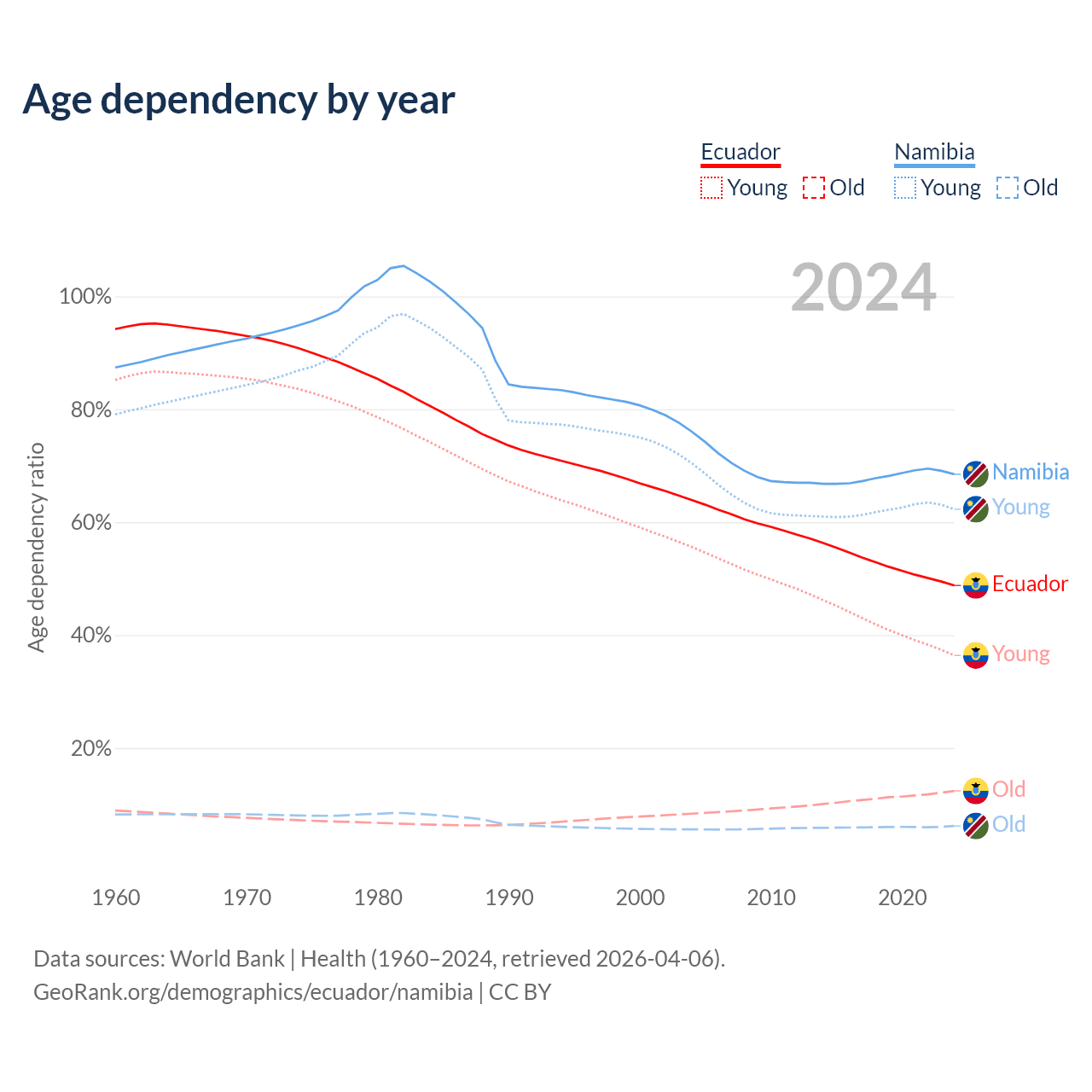 - The share of old-age demographic (65+) in Ecuador is 8.34% vs 3.67% in Namibia.