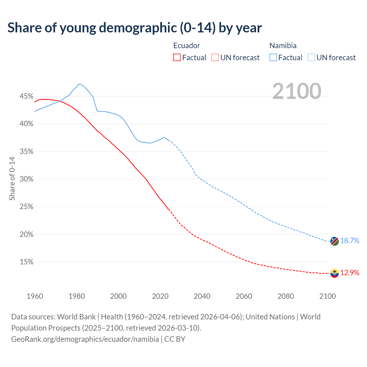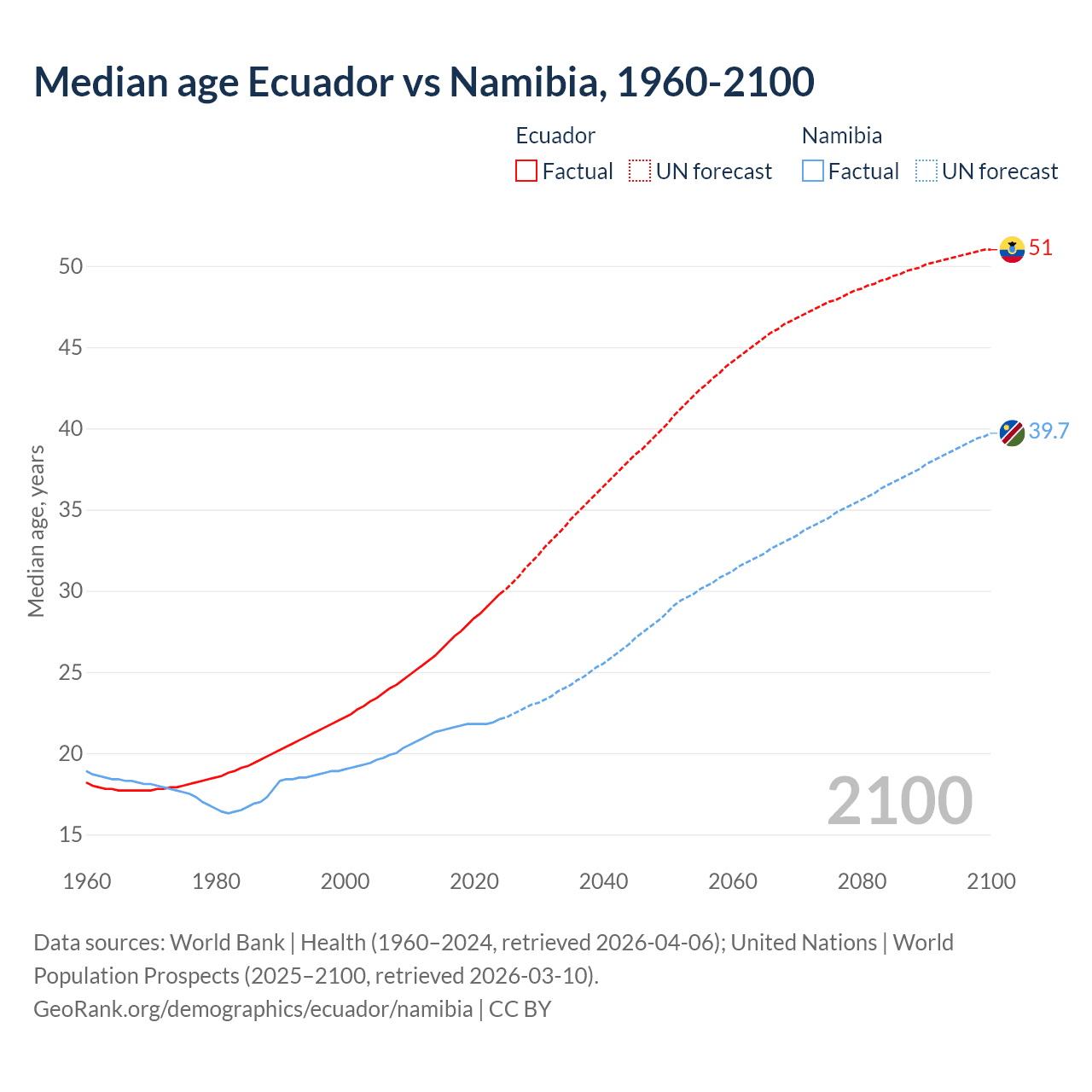 - Ecuador is ranked 105/196 by median age (oldest to youngest) vs 147/196 for Namibia.
