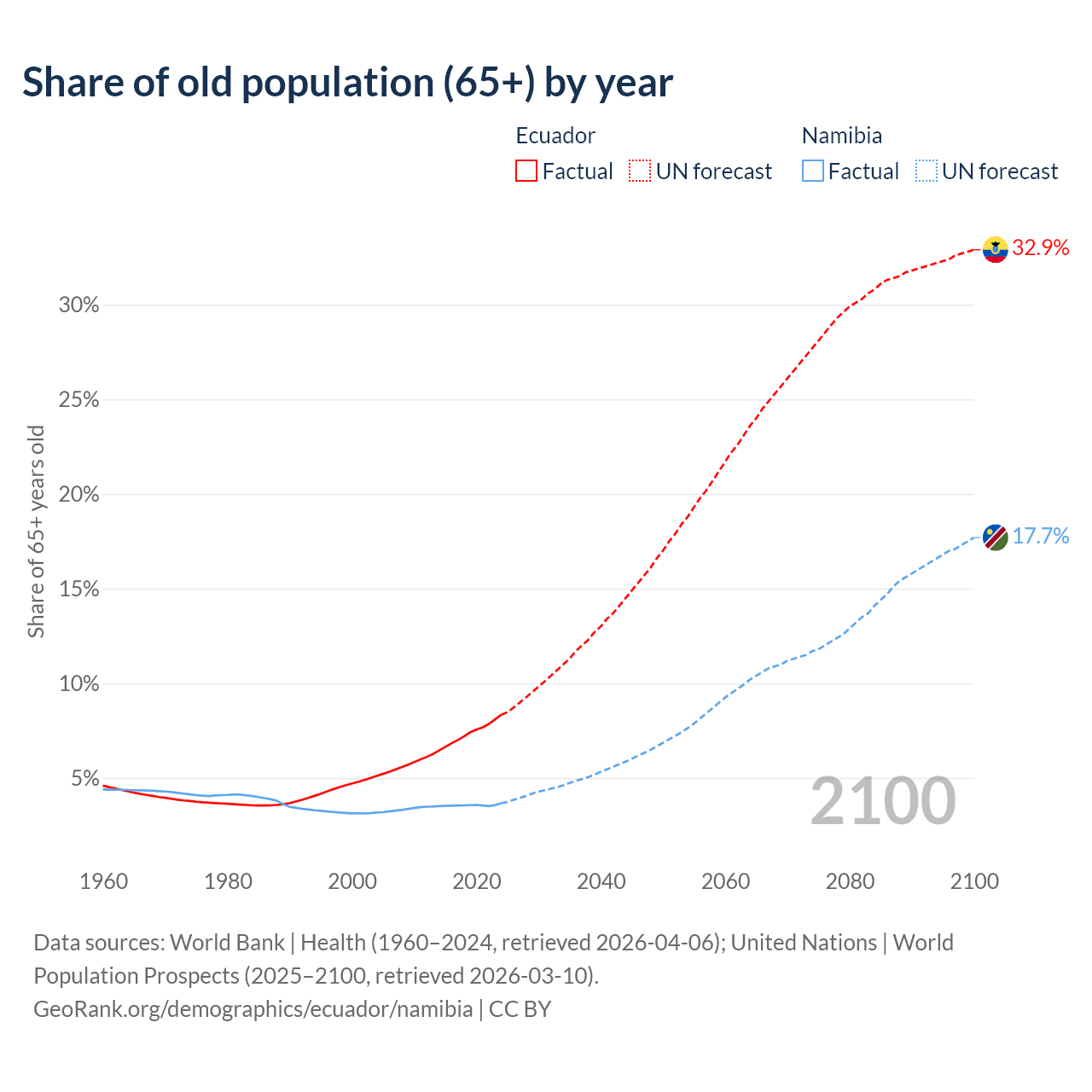 The share of older people aged 65 and over is 8.34% in Ecuador and 3.67% in Namibia. Life expectancy in Ecuador compared to Namibia .