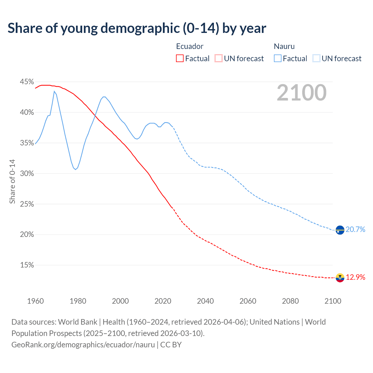 - The share of young demographic (0-15 years old) in Ecuador is 24.5% vs 37.8% in Nauru.