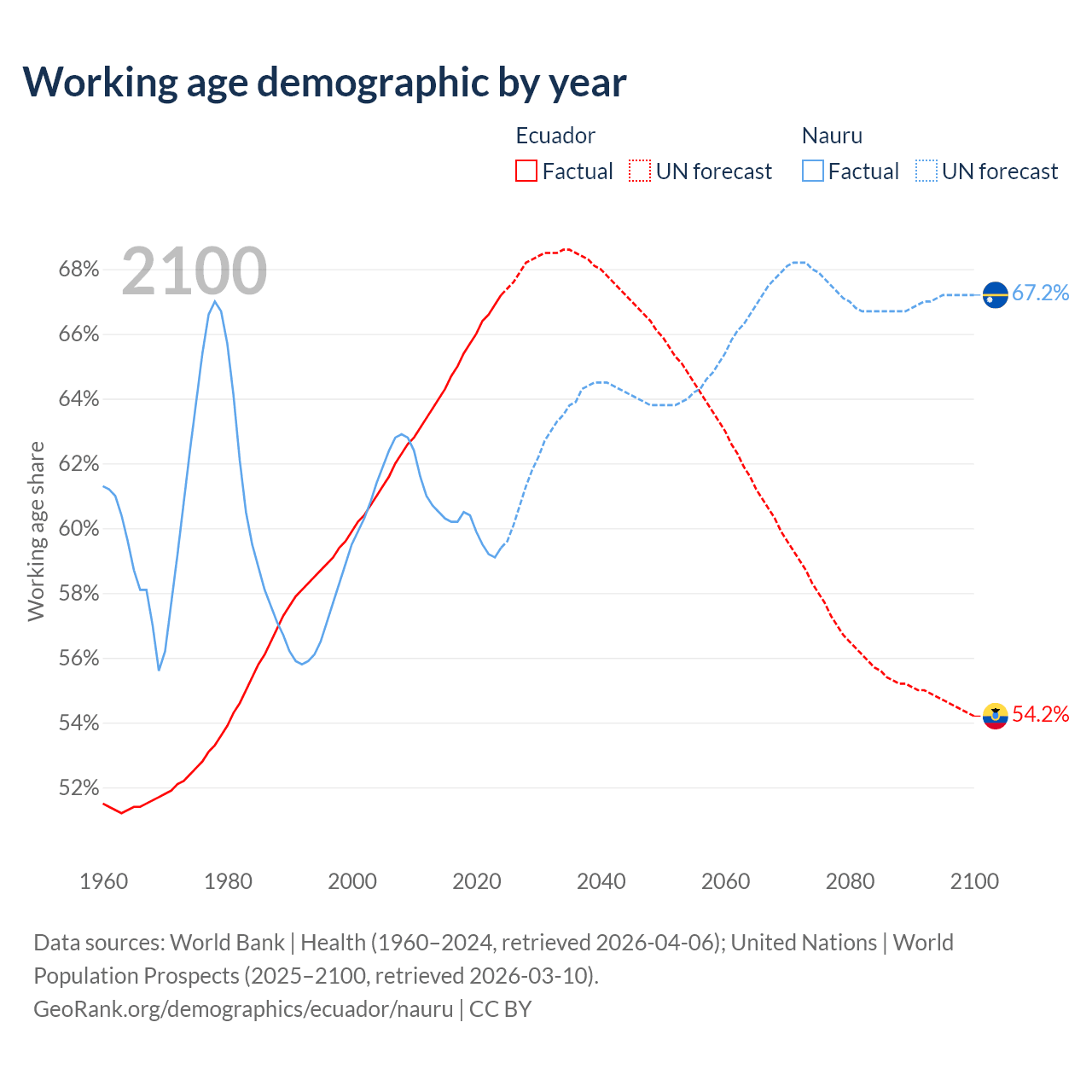 - Ecuador has 12.4M working age adults (aged 15-64) vs 7.2K in Nauru.