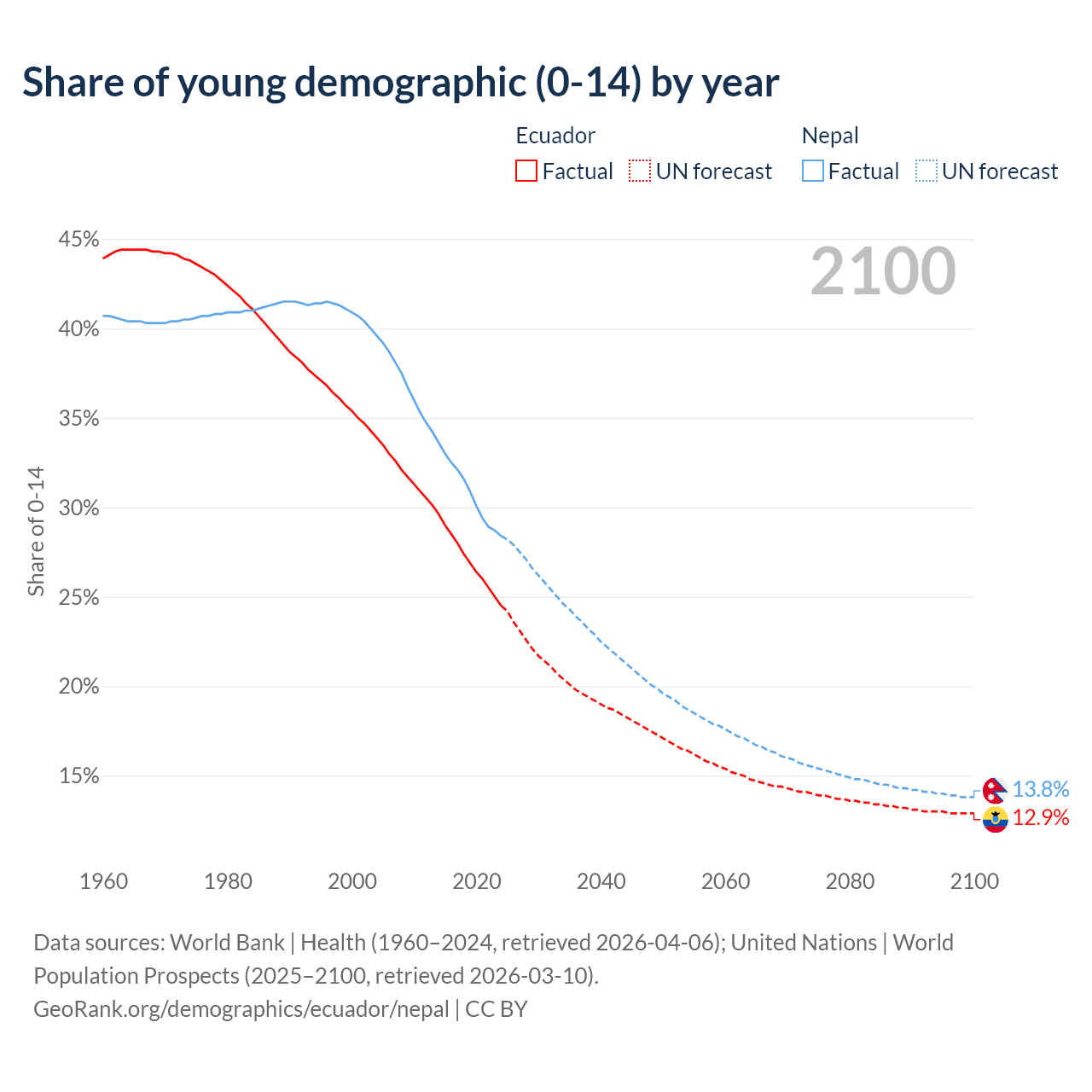 - The share of young demographic (0-15 years old) in Ecuador is 24.5% vs 28.4% in Nepal.