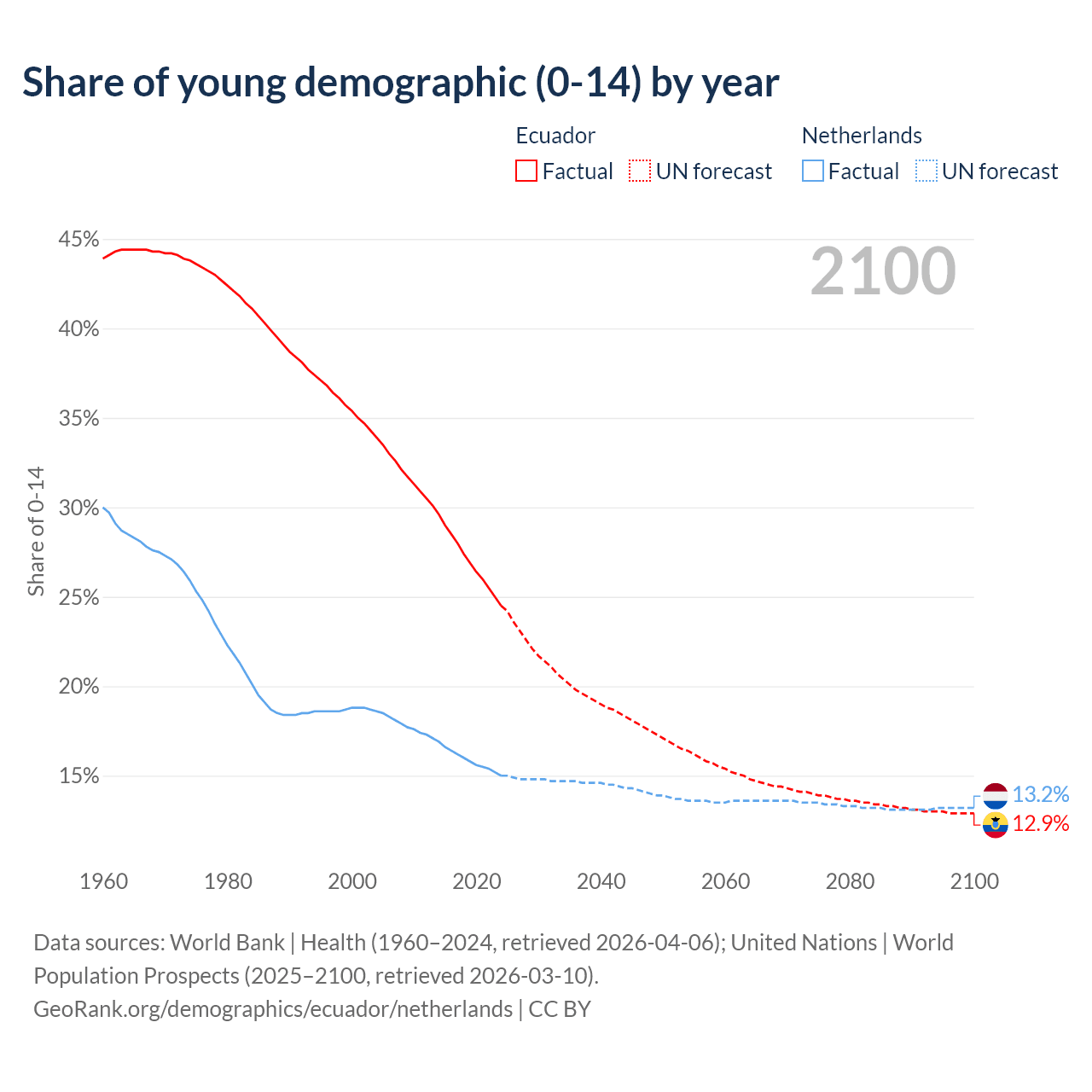 - The share of young demographic (0-15 years old) in Ecuador is 24.5% vs 15% in the Netherlands.