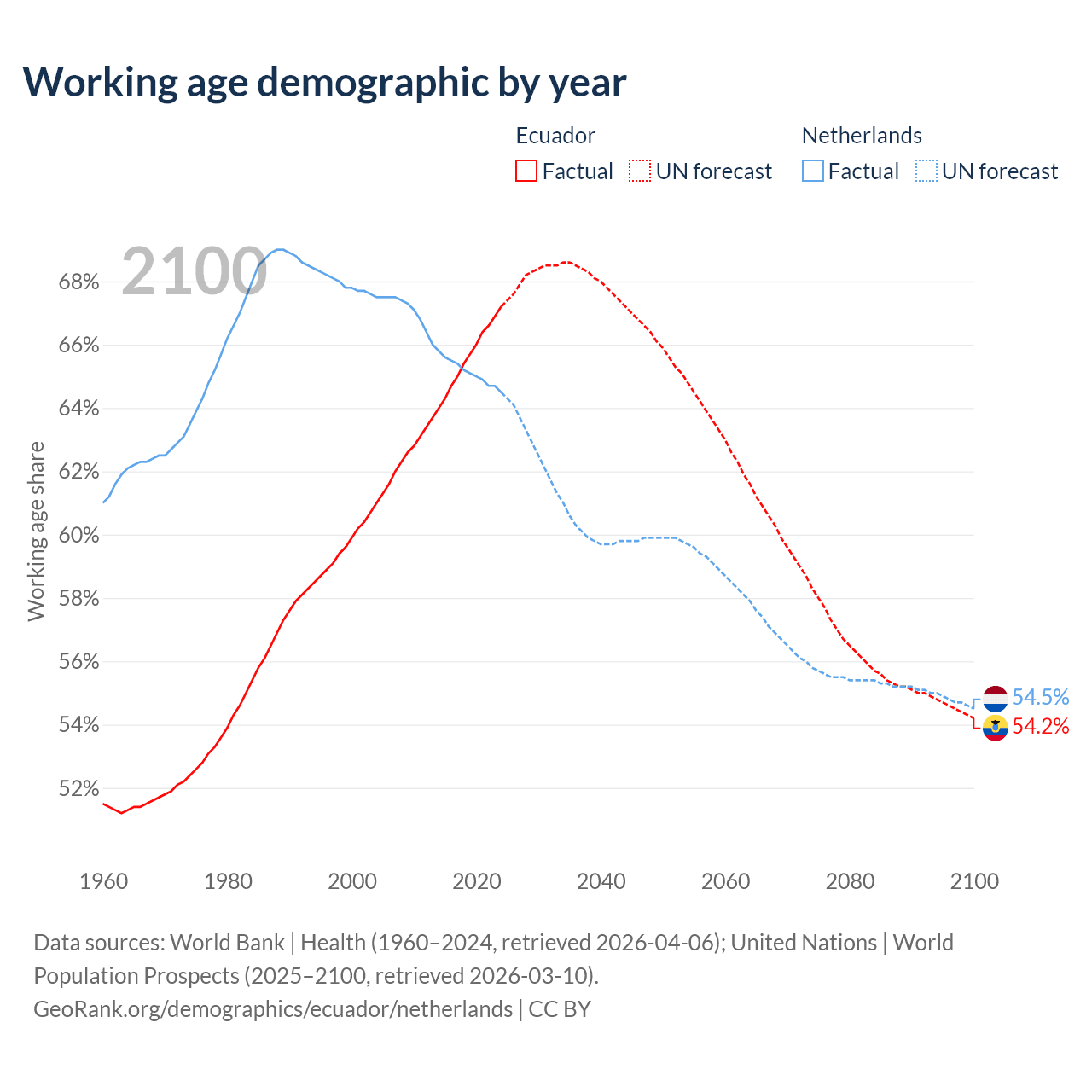- Ecuador has 12.4M working age adults (aged 15-64) vs 11.8M in the Netherlands.