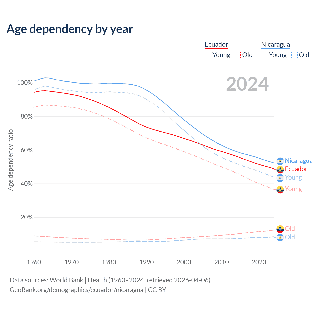 Data sources: World Bank | Health (1960–2024, retrieved 2026-04-06); U.S. Census Bureau (1960–2024, retrieved 2026-02-08).