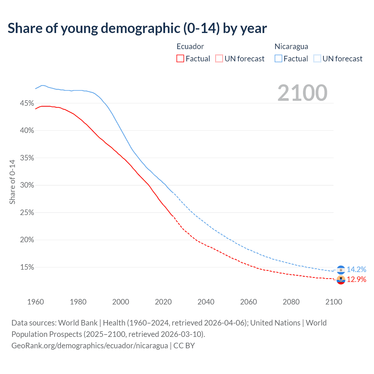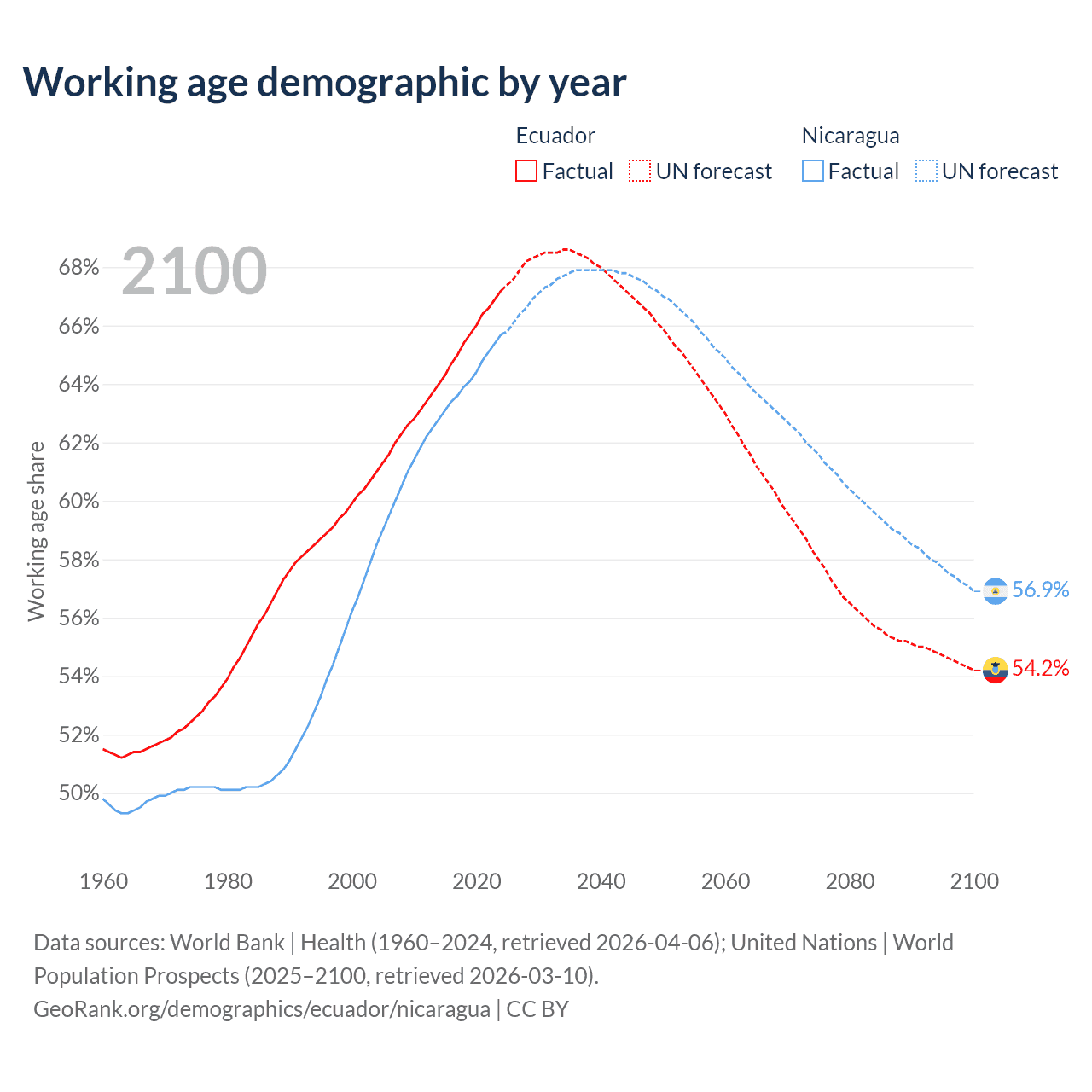 Median age Ecuador vs Nicaragua, 1960-2100