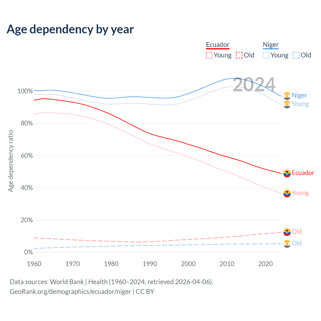 - The share of old-age demographic (65+) in Ecuador is 8.34% vs 2.59% in Niger.