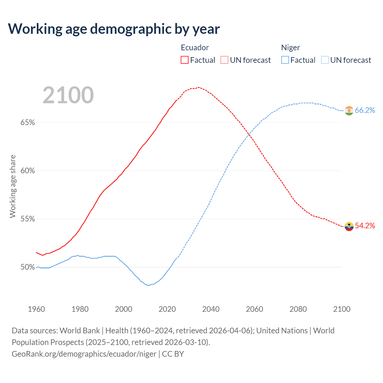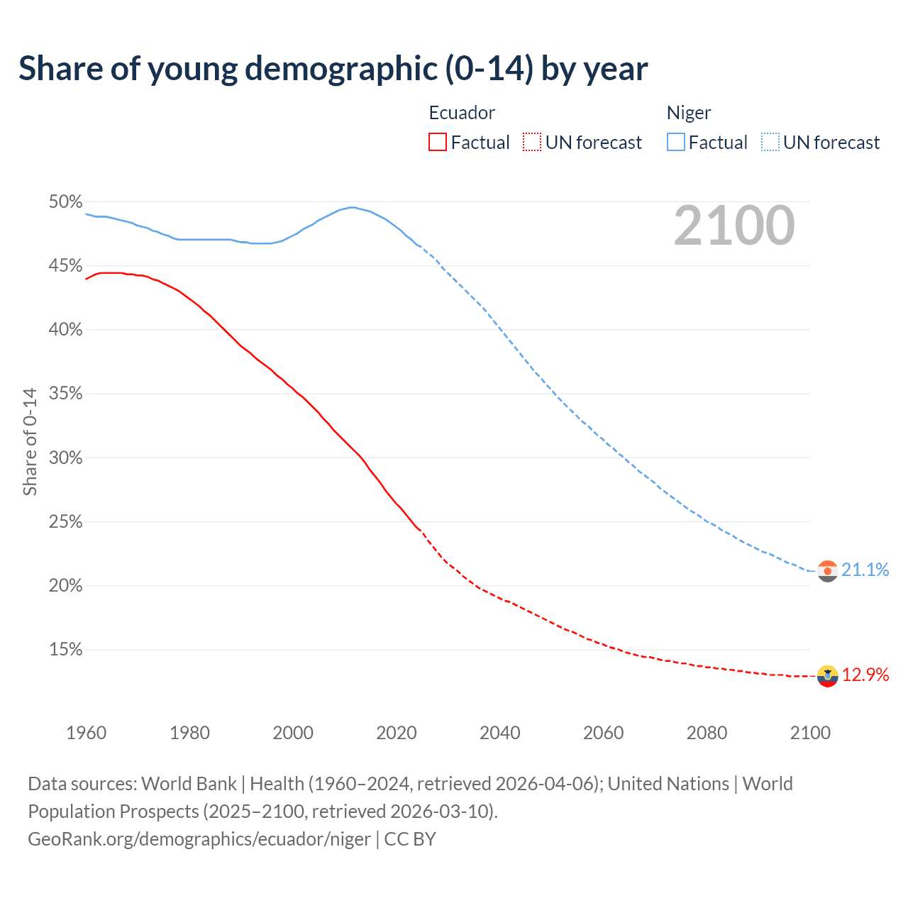 Median age Ecuador vs Niger, 1960-2100