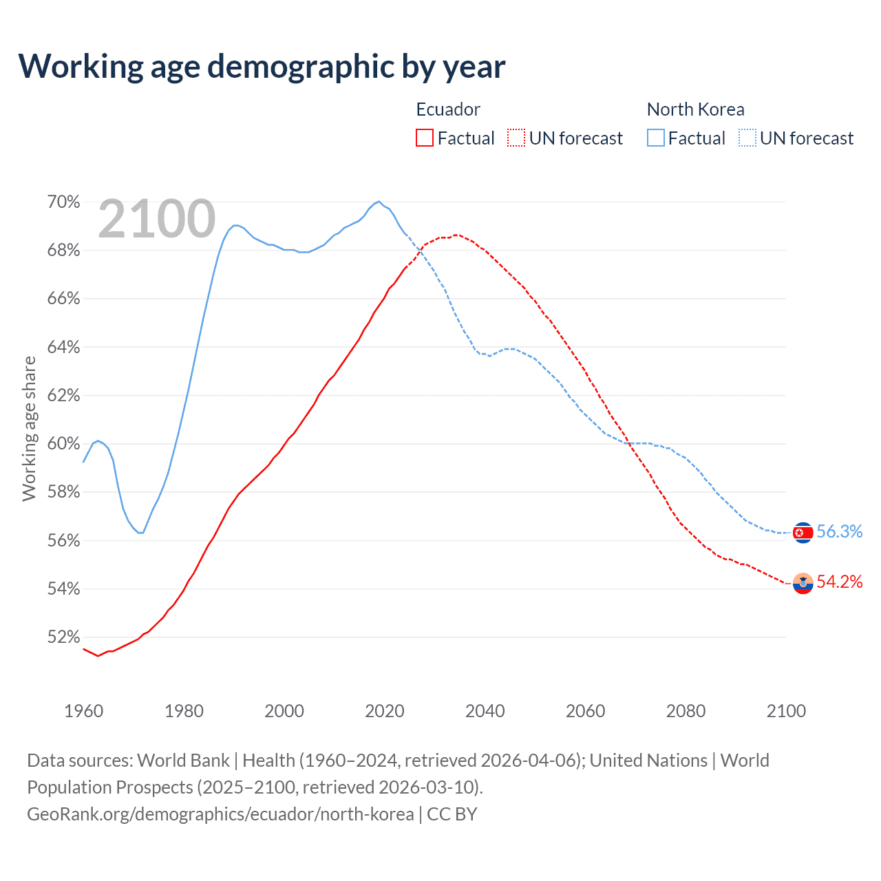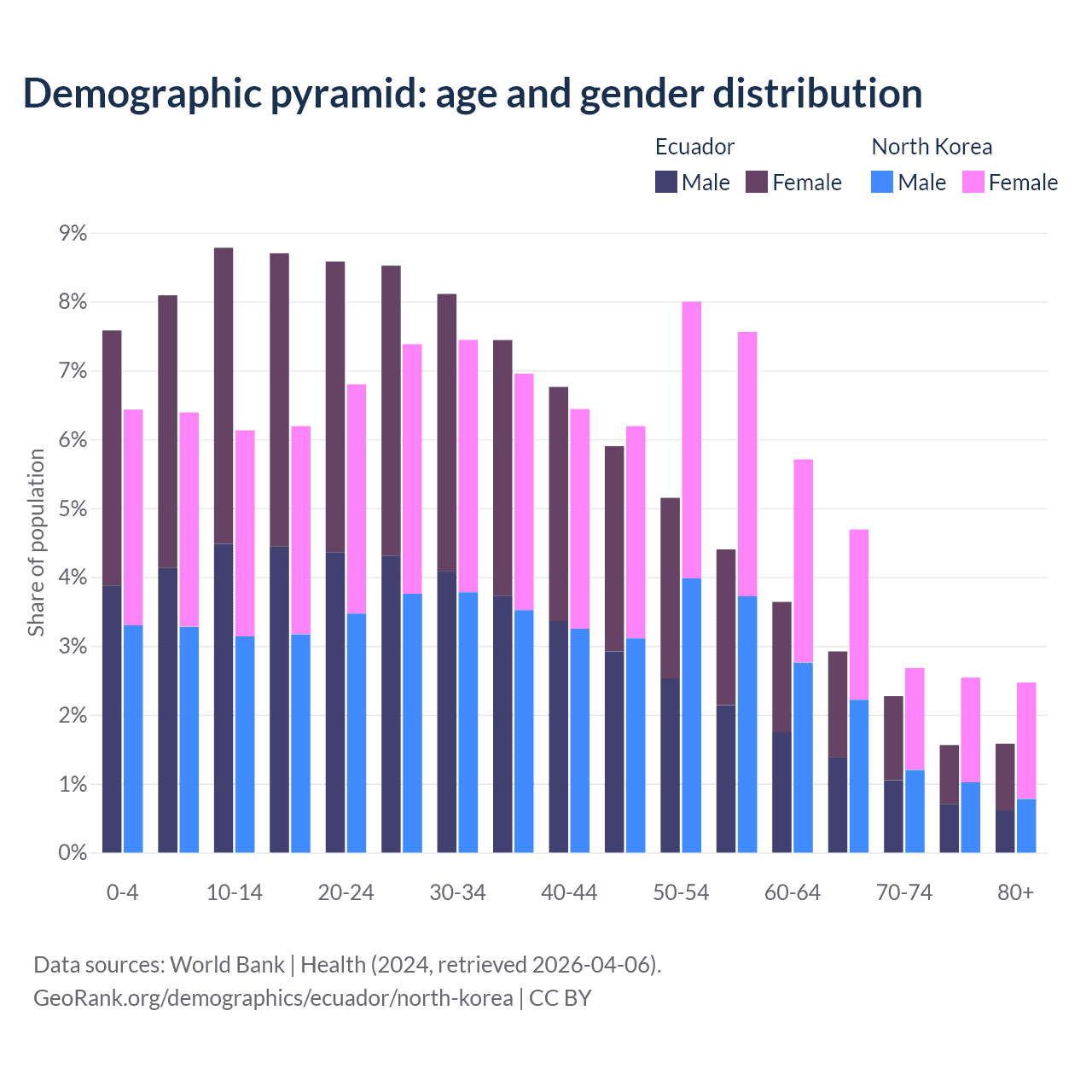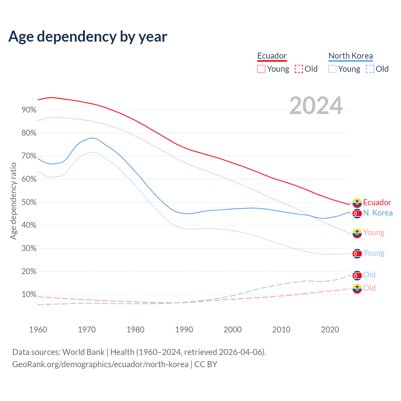- The share of old-age demographic (65+) in Ecuador is 8.34% vs 12.4% in North Korea.