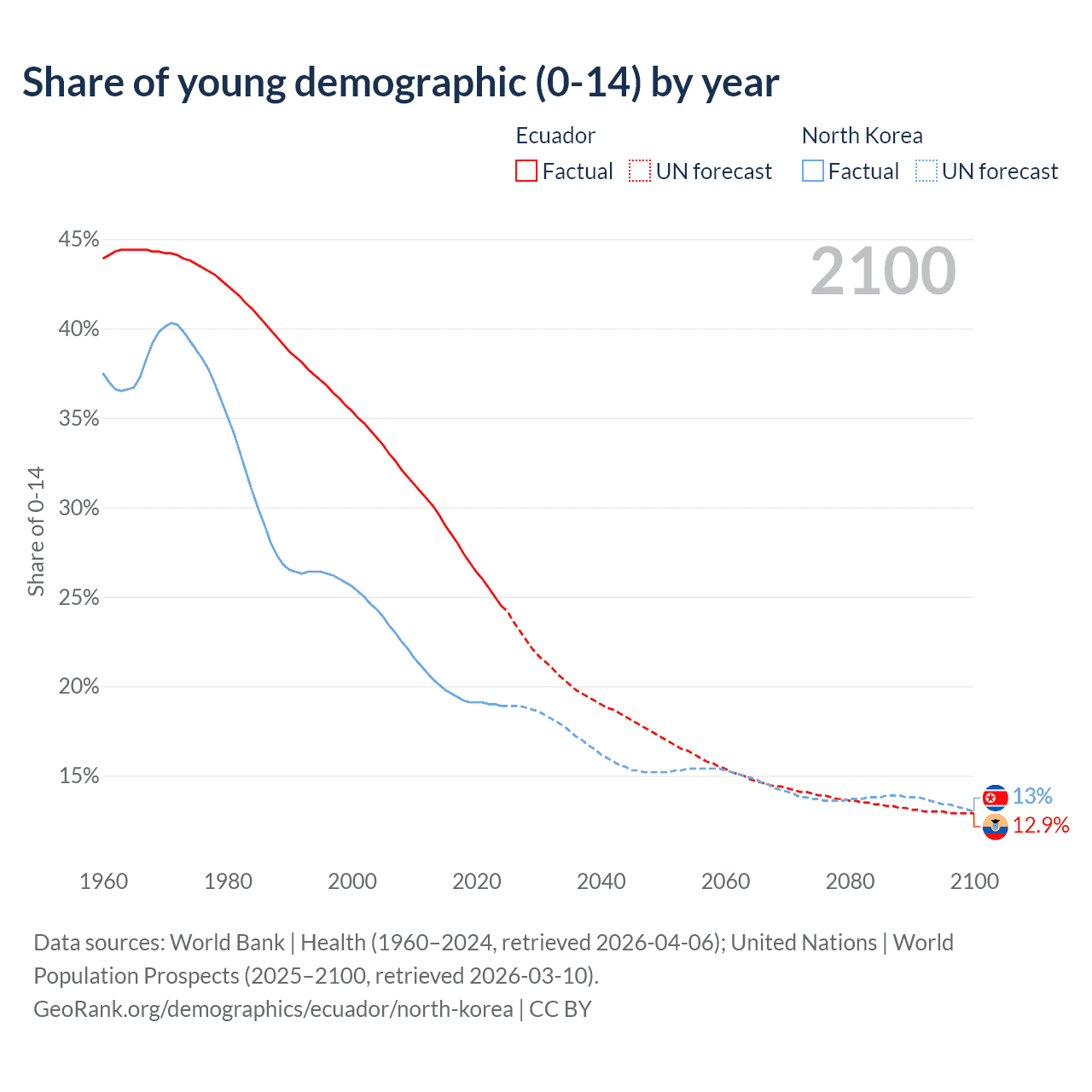 - The share of young demographic (0-15 years old) in Ecuador is 24.5% vs 18.9% in North Korea.