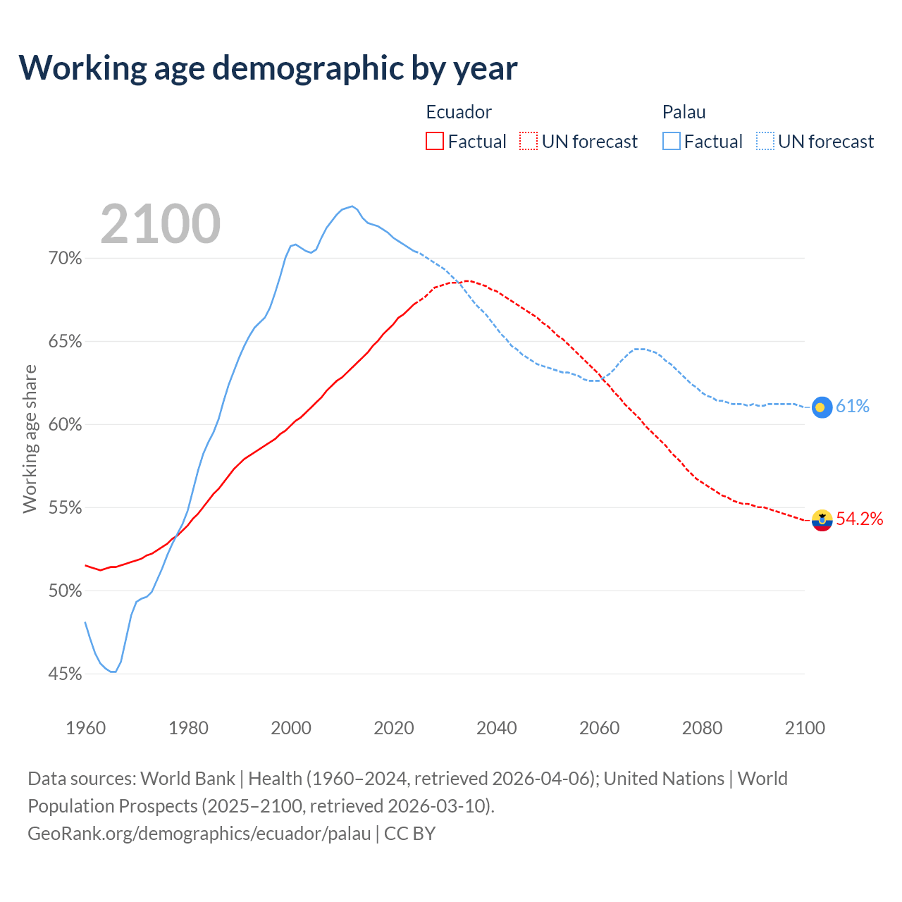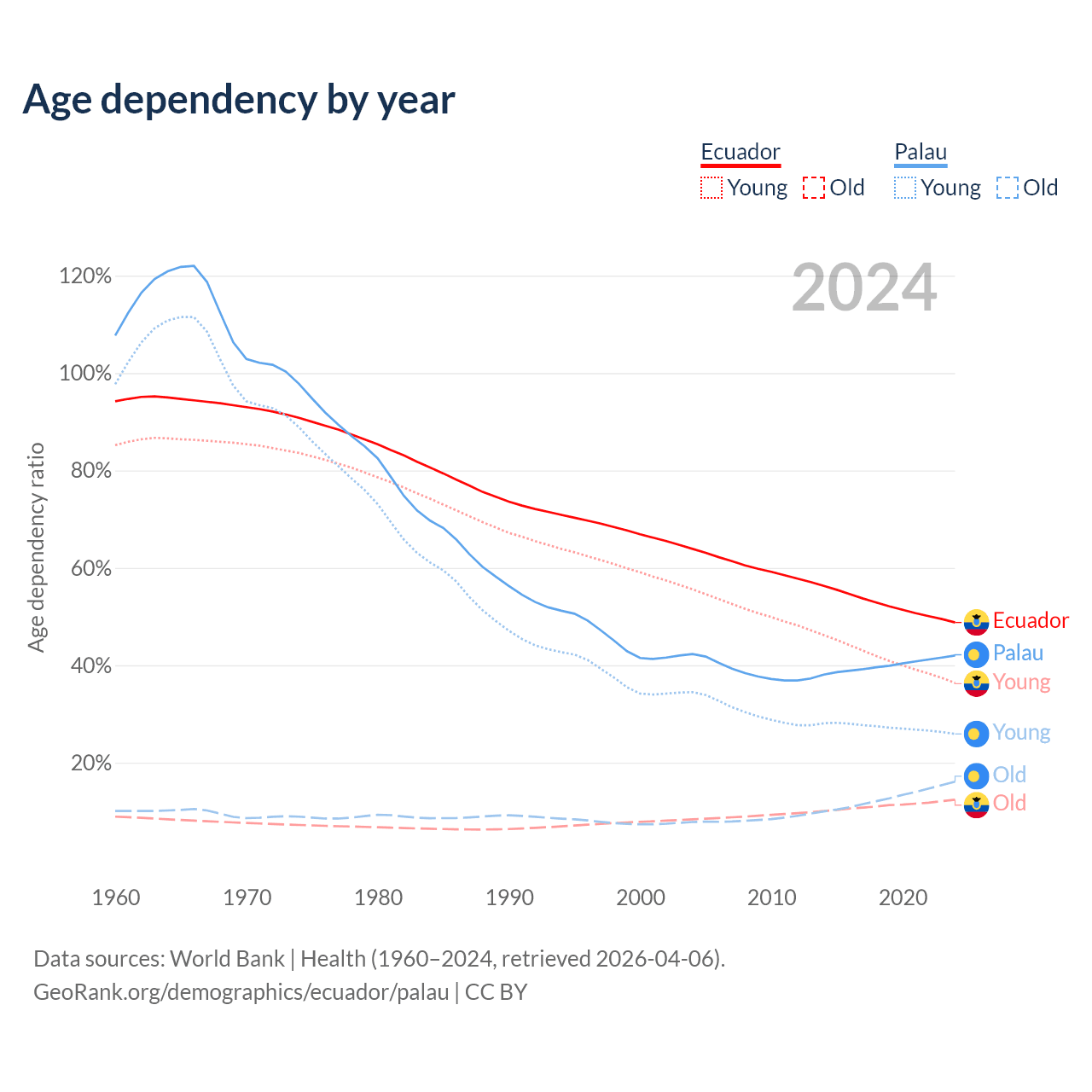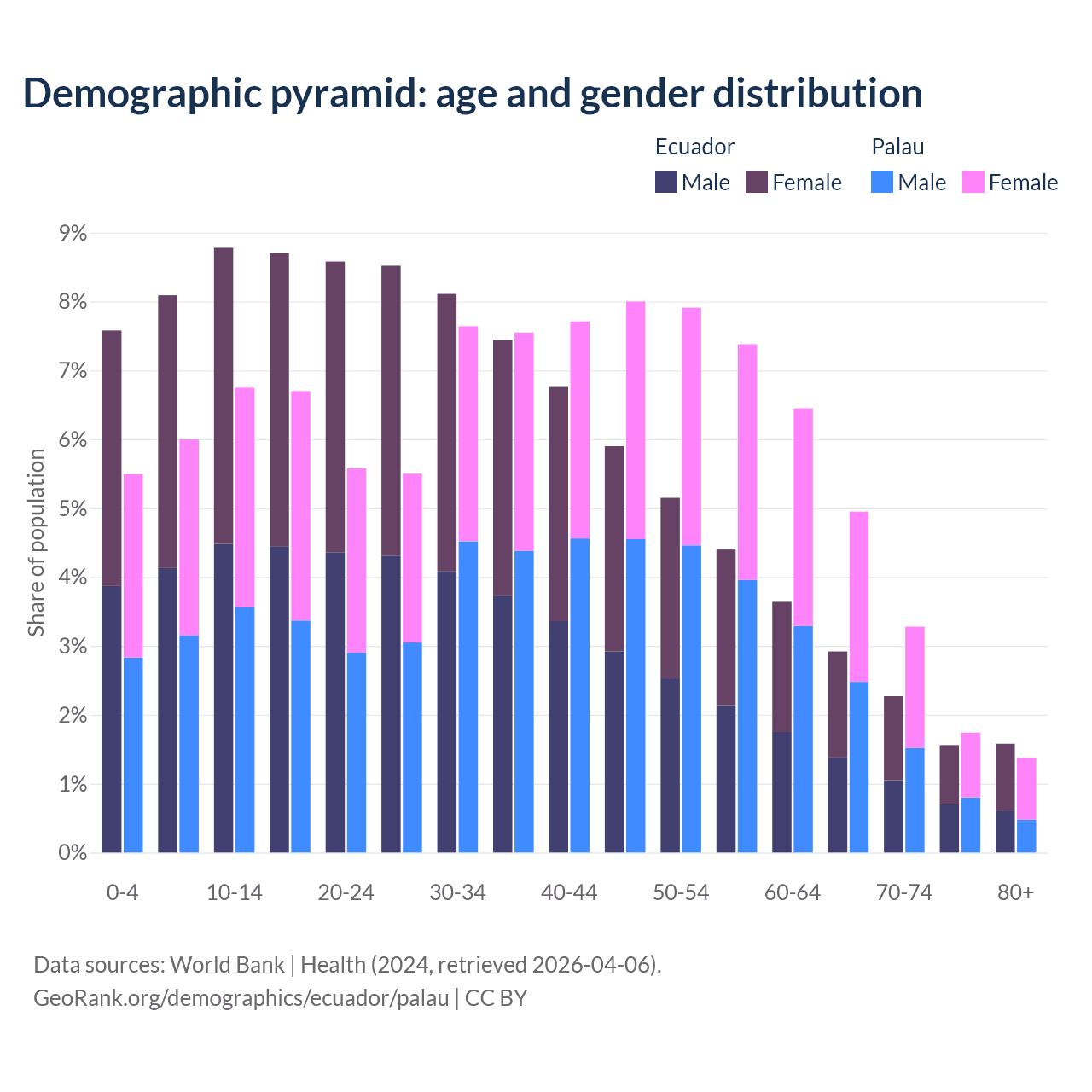 - The share of young demographic (0-15 years old) in Ecuador is 24.5% vs 18.2% in Palau.