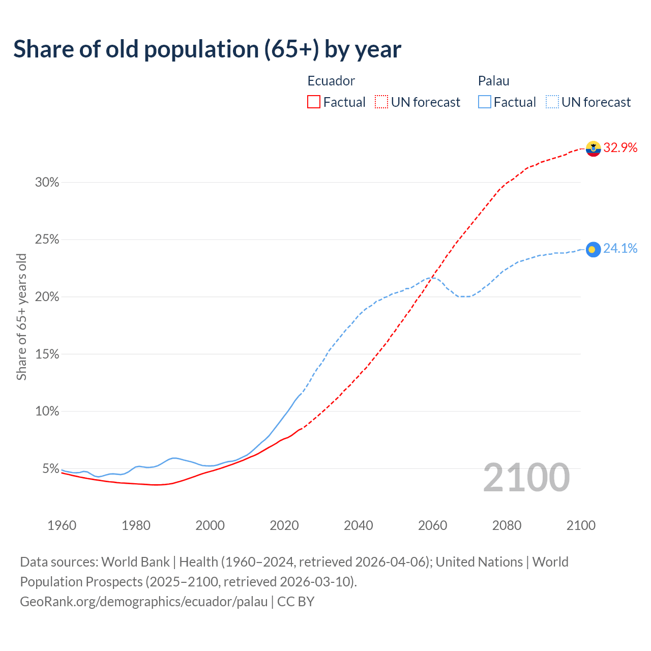The share of older people aged 65 and over is 8.34% in Ecuador and 11.3% in Palau. Life expectancy in Ecuador compared to Palau .