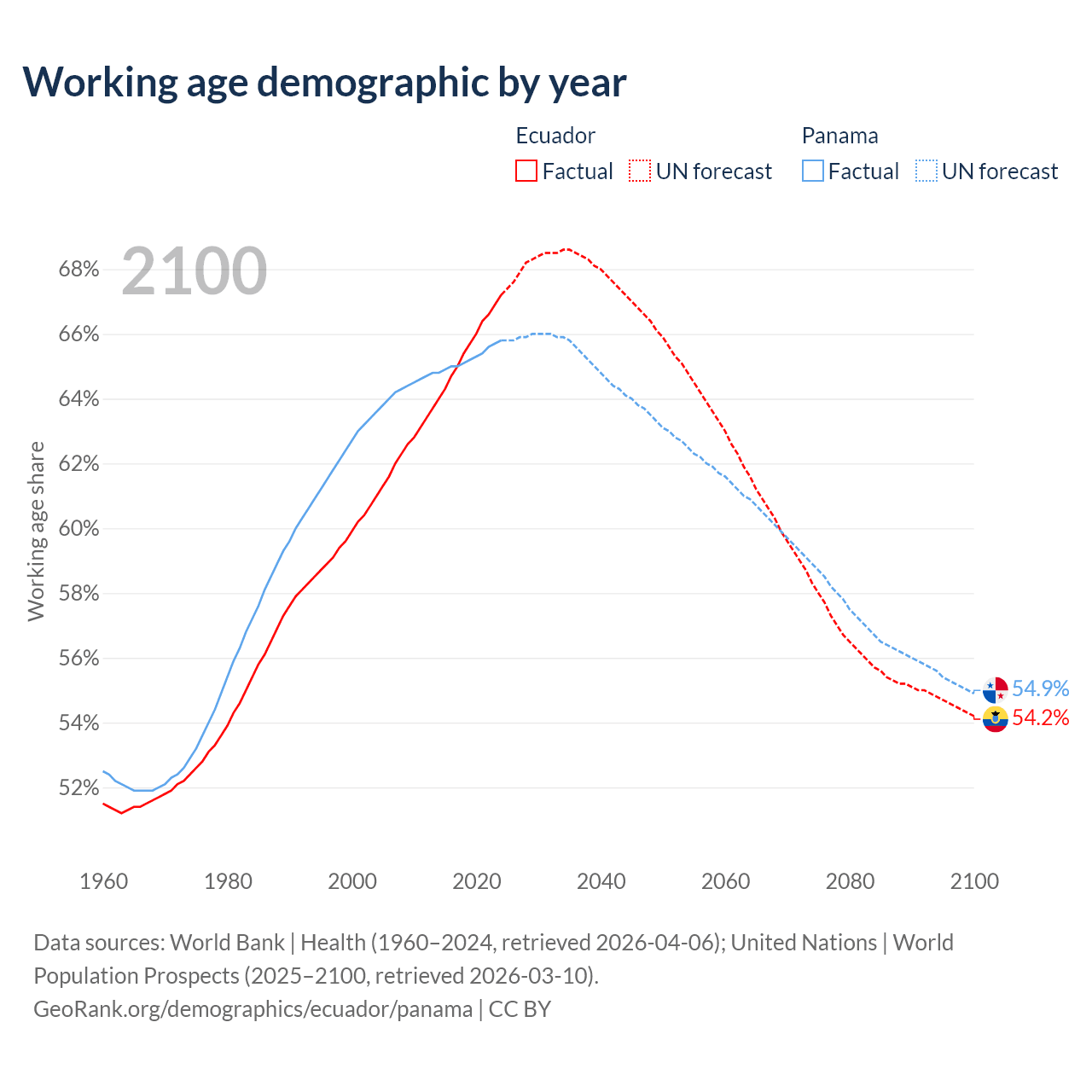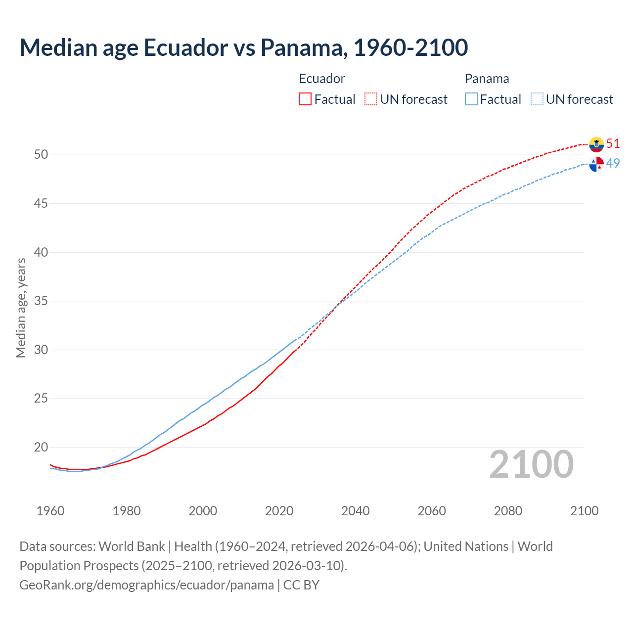 Median age Ecuador vs Panama, 1960-2100