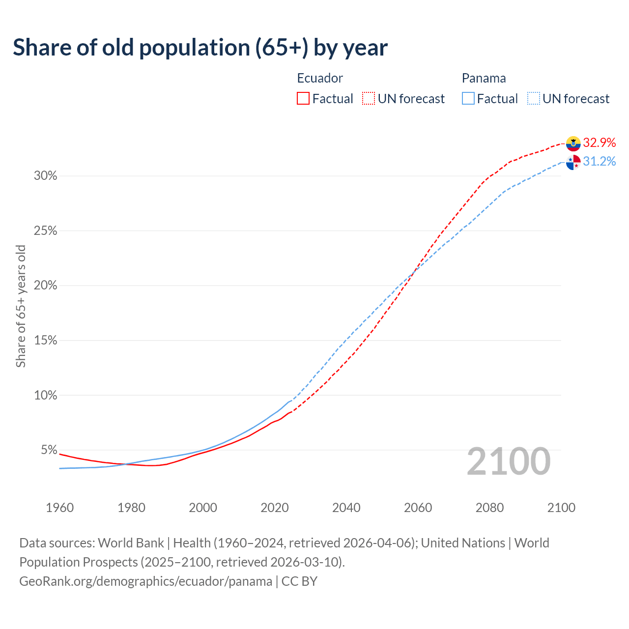 The share of older people aged 65 and over is 8.34% in Ecuador and 9.35% in Panama. Life expectancy in Ecuador compared to Panama .