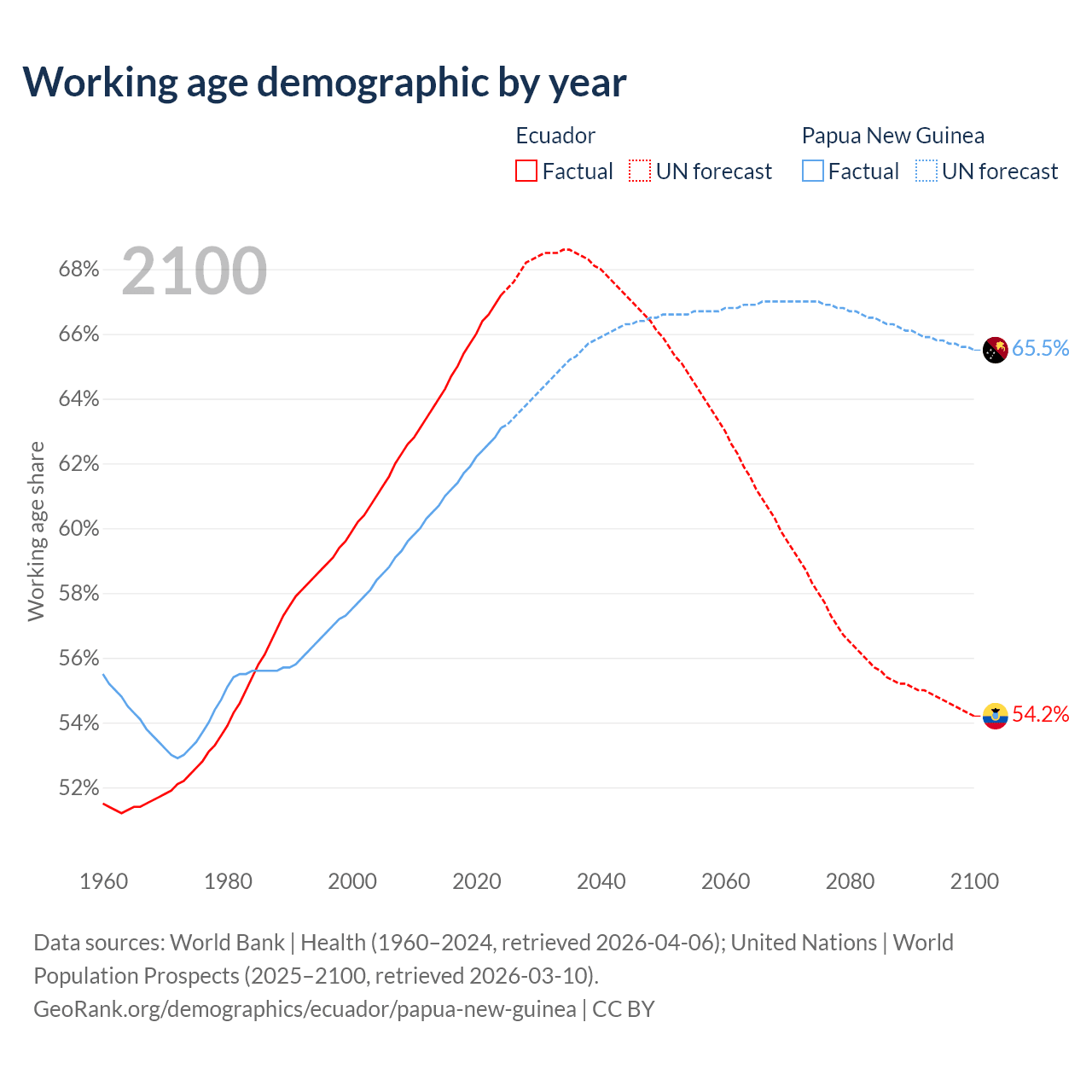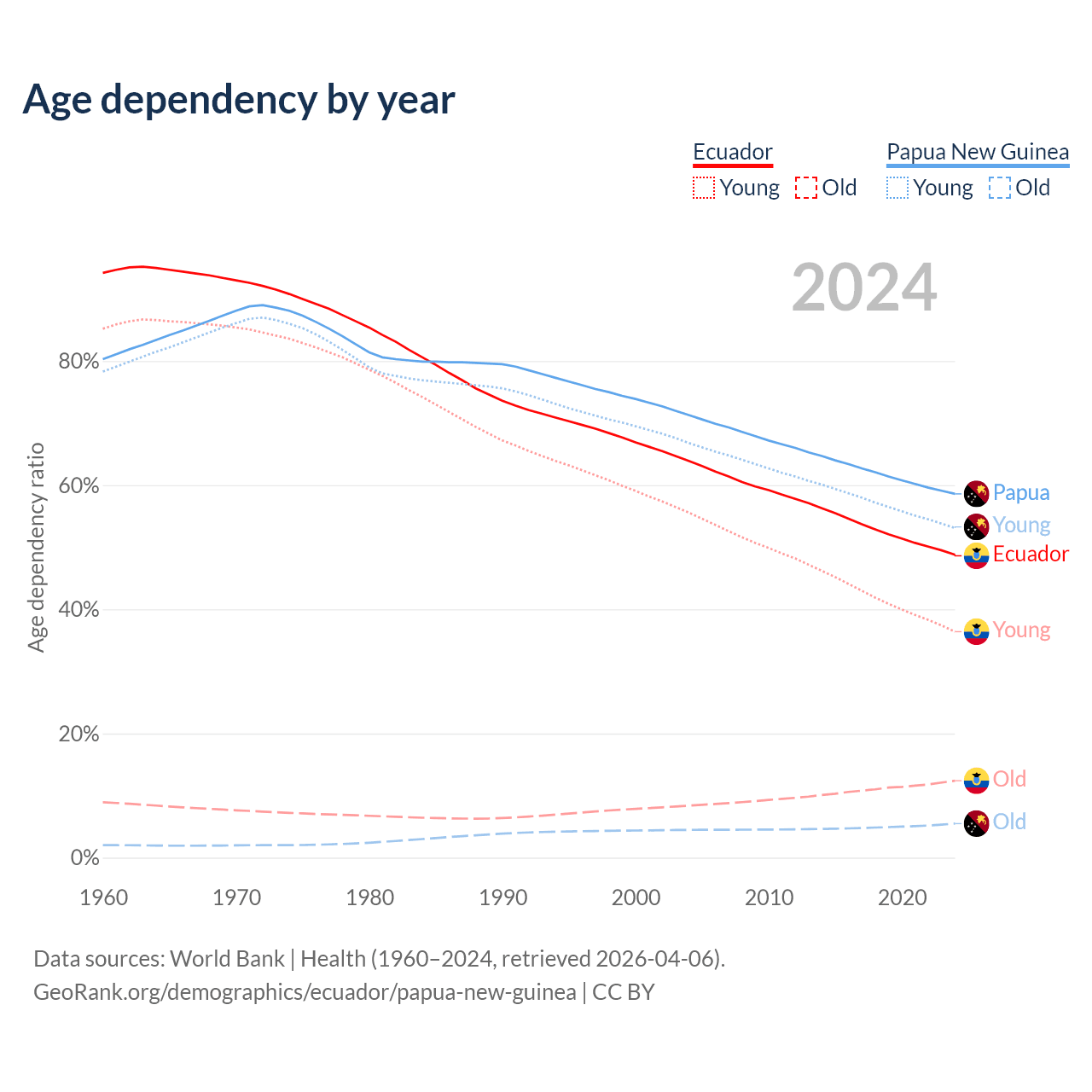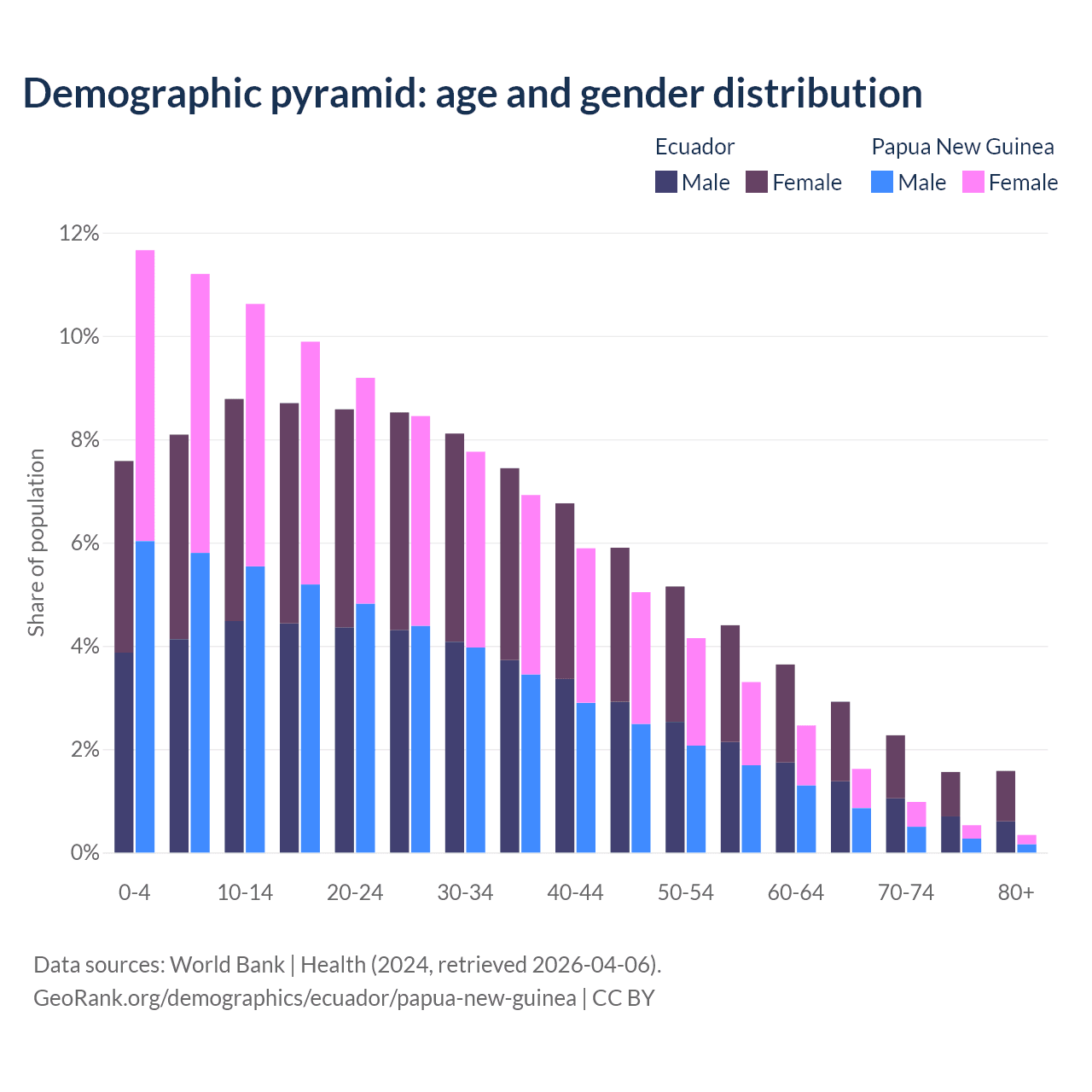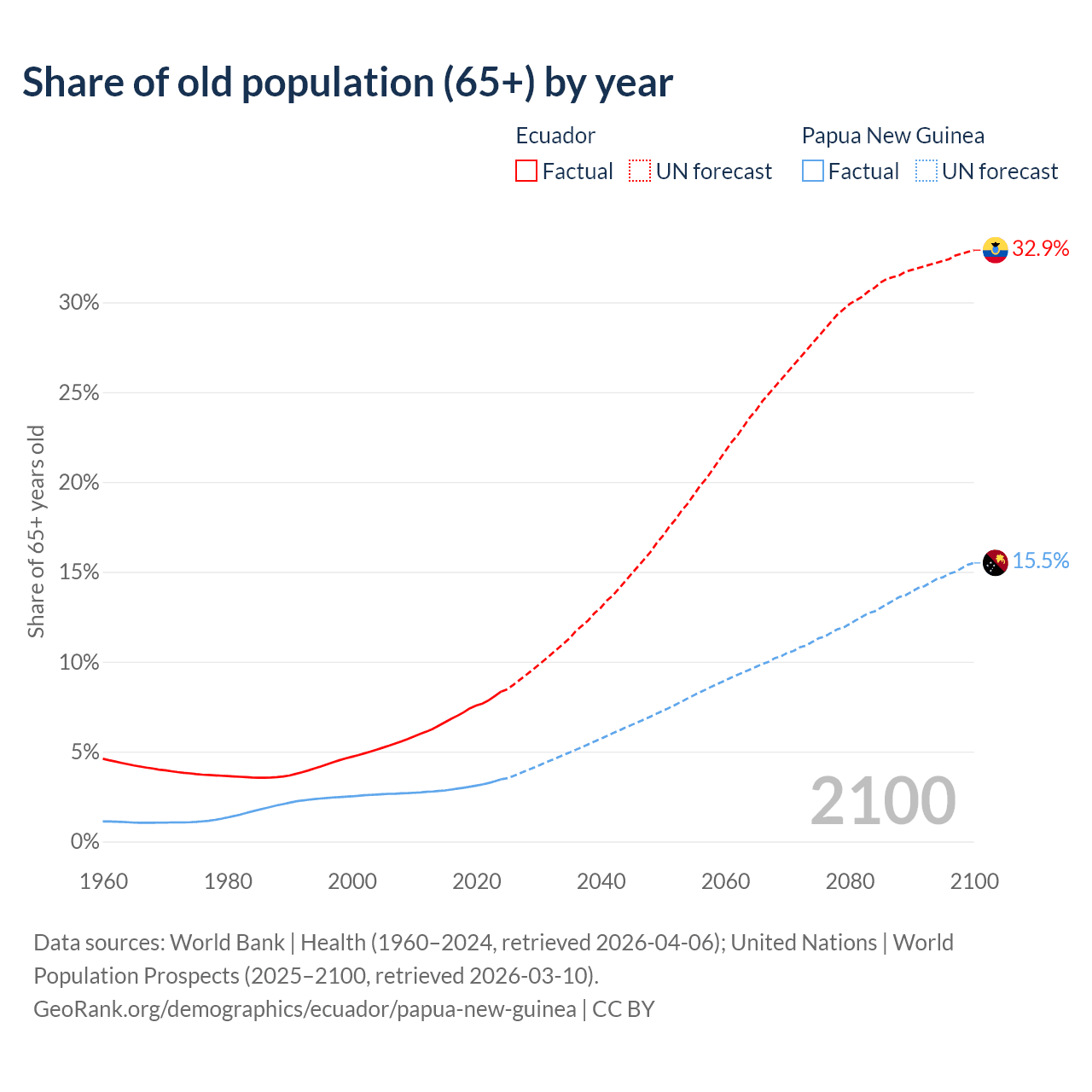 - The share of old-age demographic (65+) in Ecuador is 8.34% vs 3.46% in Papua New Guinea.
