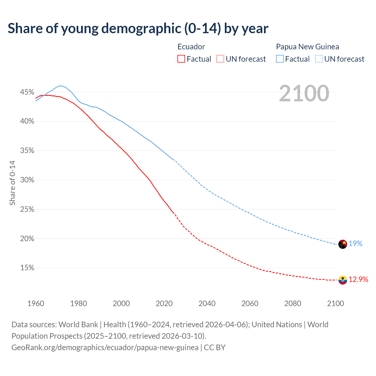 - The share of young demographic (0-15 years old) in Ecuador is 24.5% vs 33.5% in Papua New Guinea.