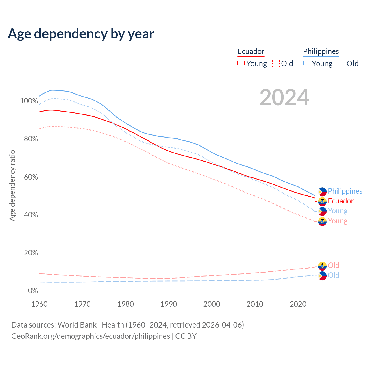 - Ecuador is ranked 105/196 by median age (oldest to youngest) vs 123/196 for the Philippines.