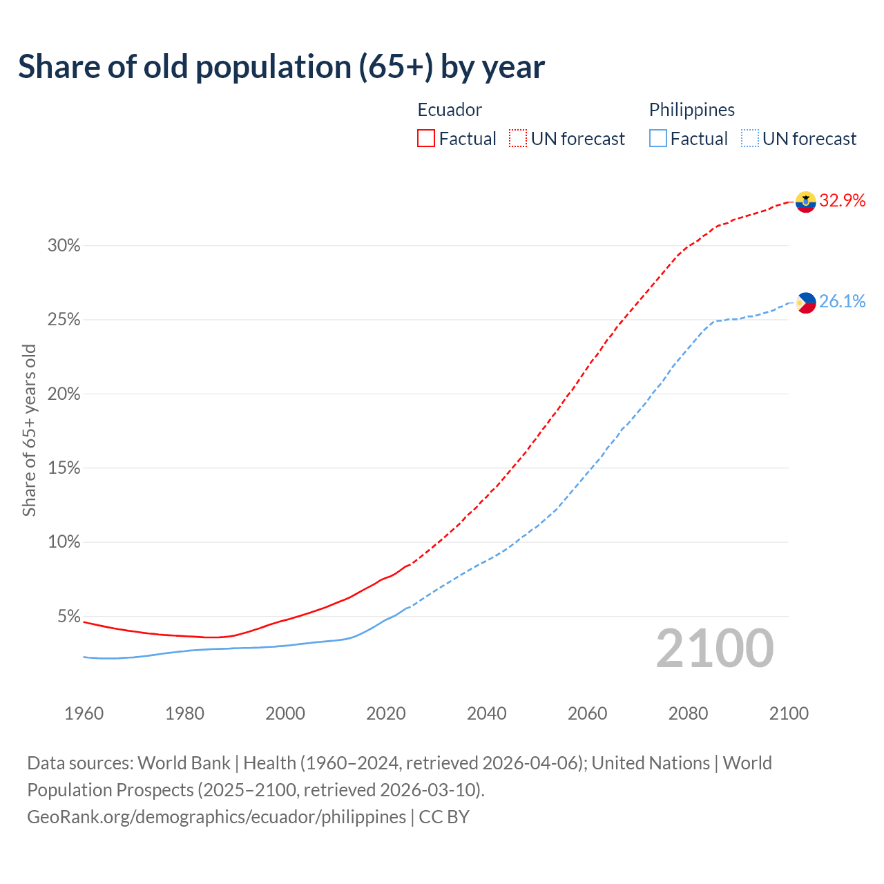 The share of older people aged 65 and over is 8.34% in Ecuador and 5.49% in the Philippines. Life expectancy in Ecuador compared to the Philippines .