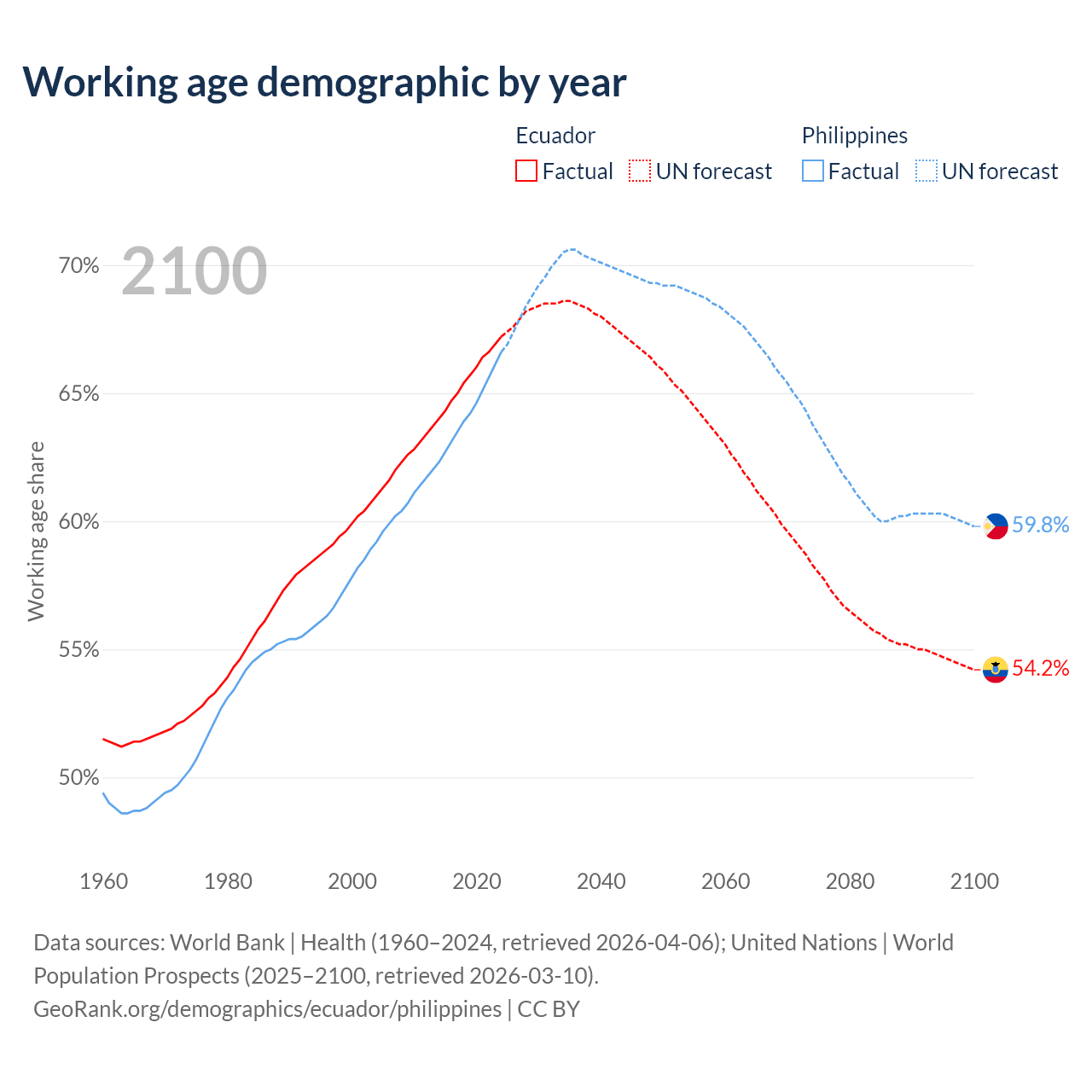 - Ecuador has 12.4M working age adults (aged 15-64) vs 78.6M in the Philippines.