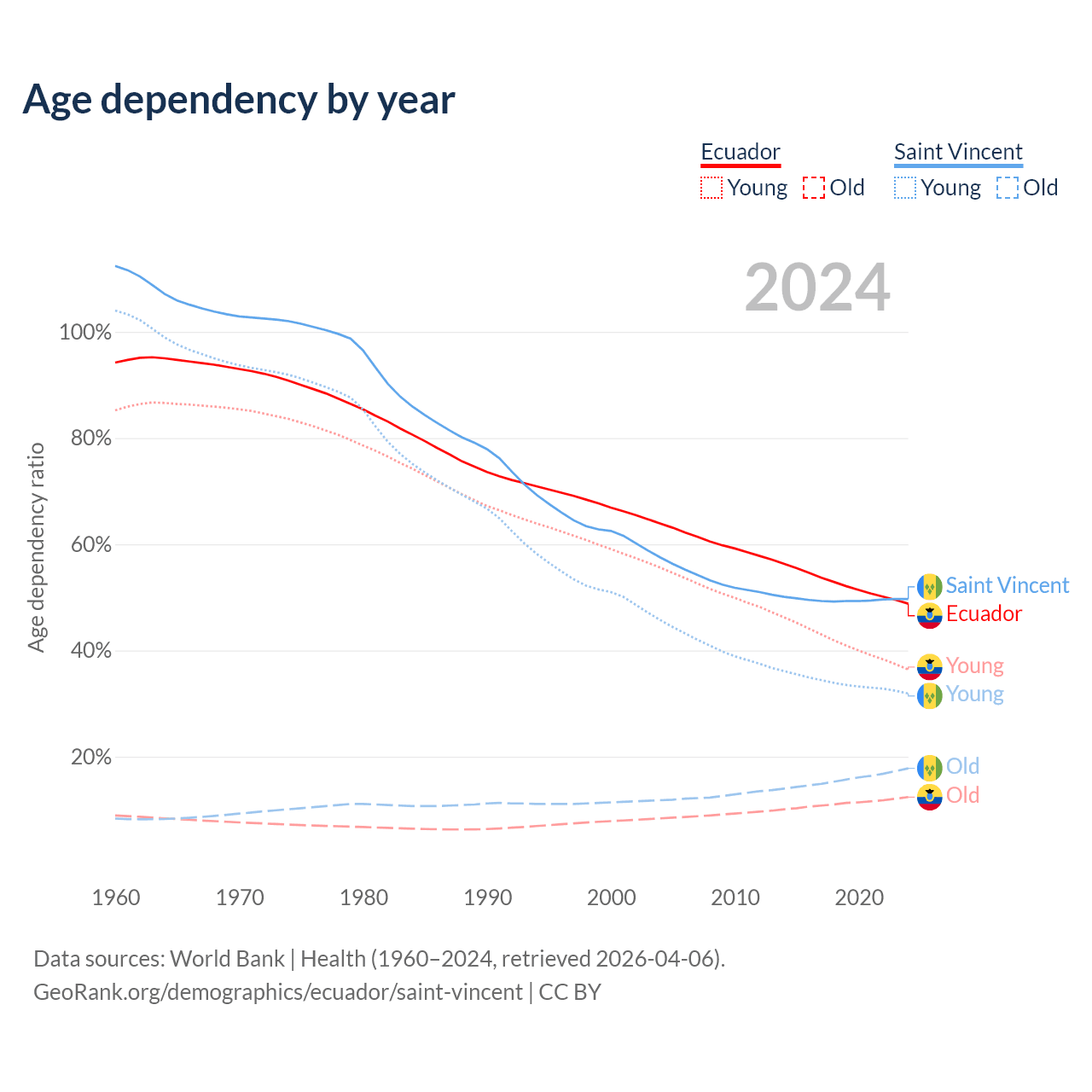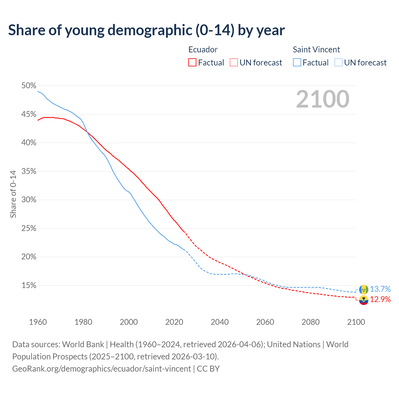 - The share of young demographic (0-15 years old) in Ecuador is 24.5% vs 21.3% in Saint Vincent.
