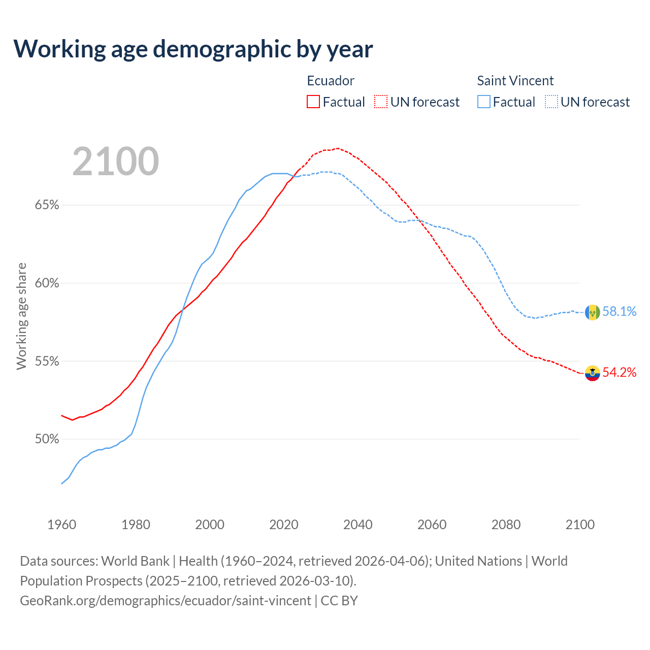 - Ecuador has 12.4M working age adults (aged 15-64) vs 66.3K in Saint Vincent.