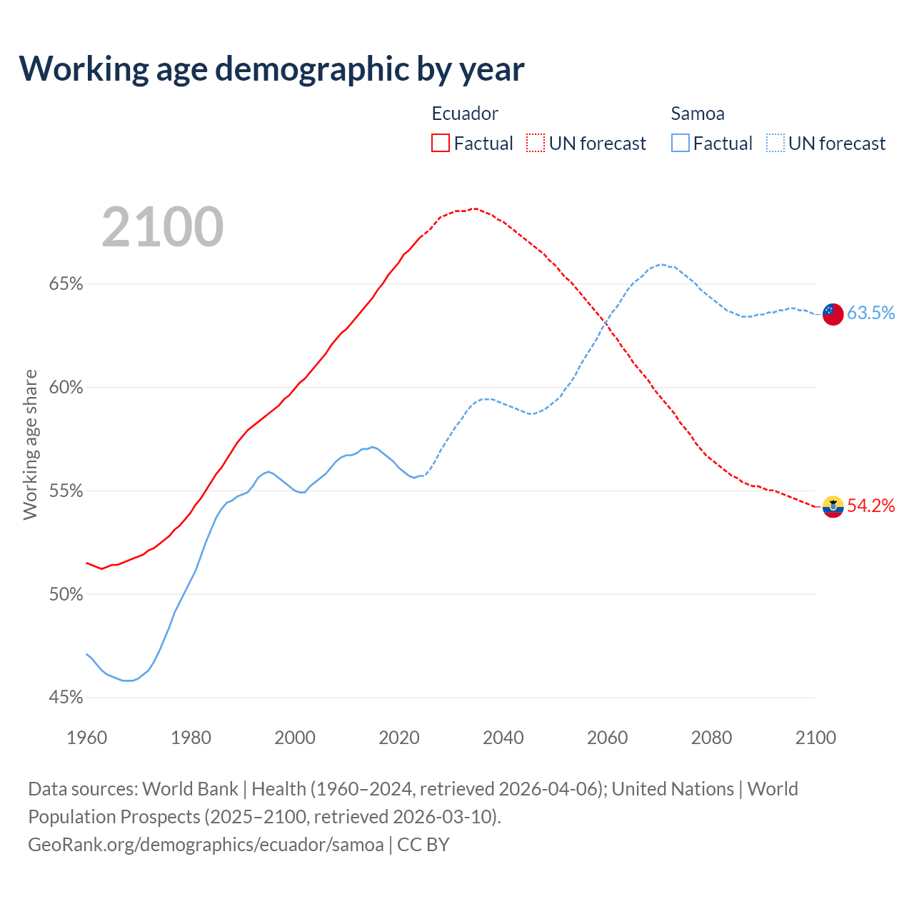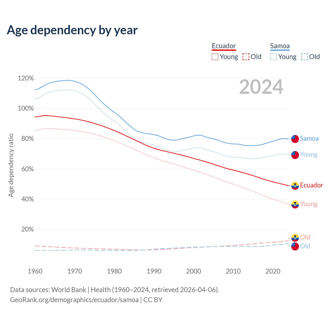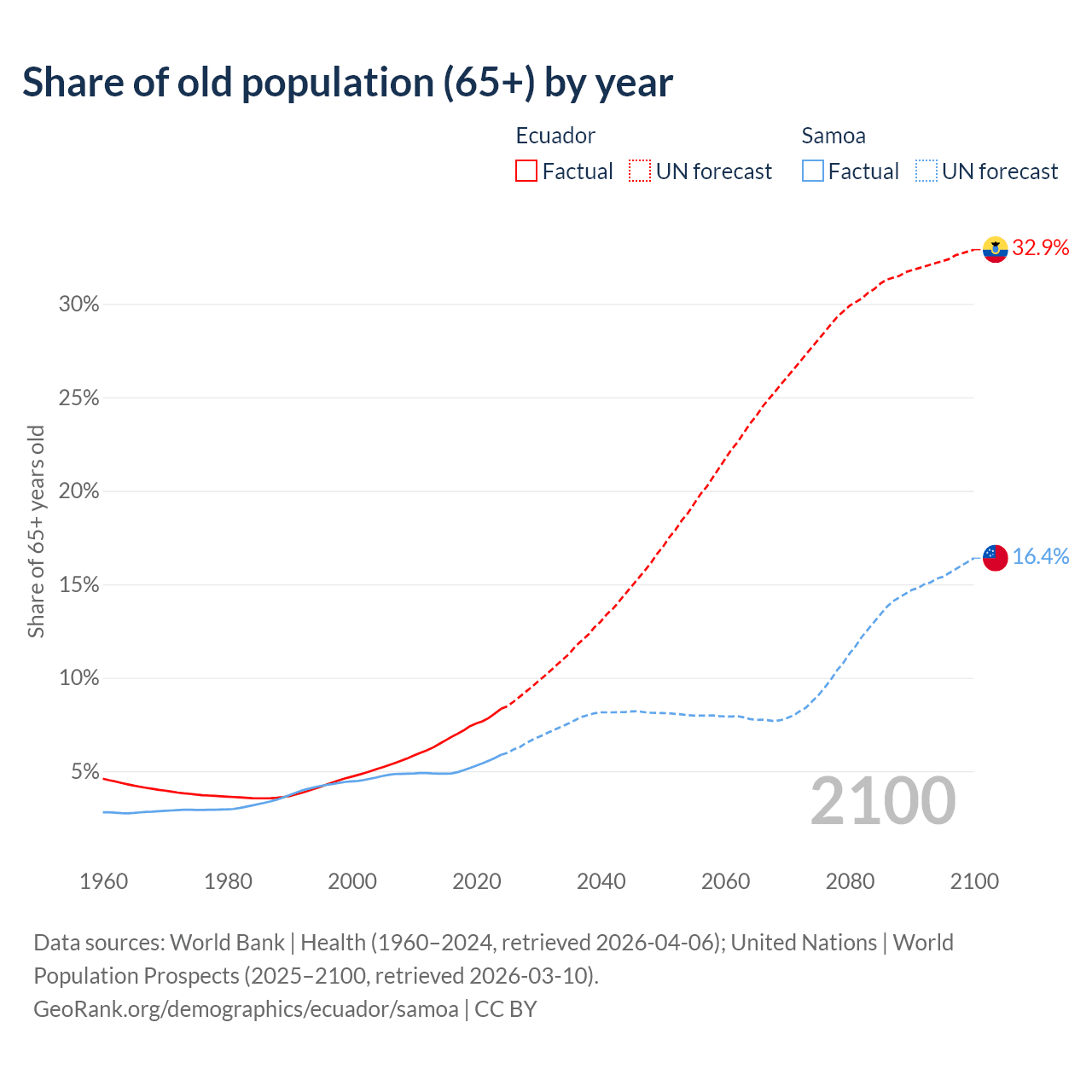- The share of old-age demographic (65+) in Ecuador is 8.34% vs 5.88% in Samoa.