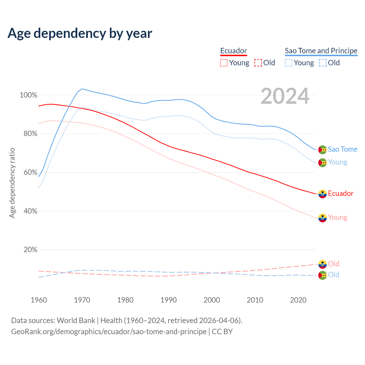 - Ecuador is ranked 105/196 by median age (oldest to youngest) vs 163/196 for Sao Tome and Principe.