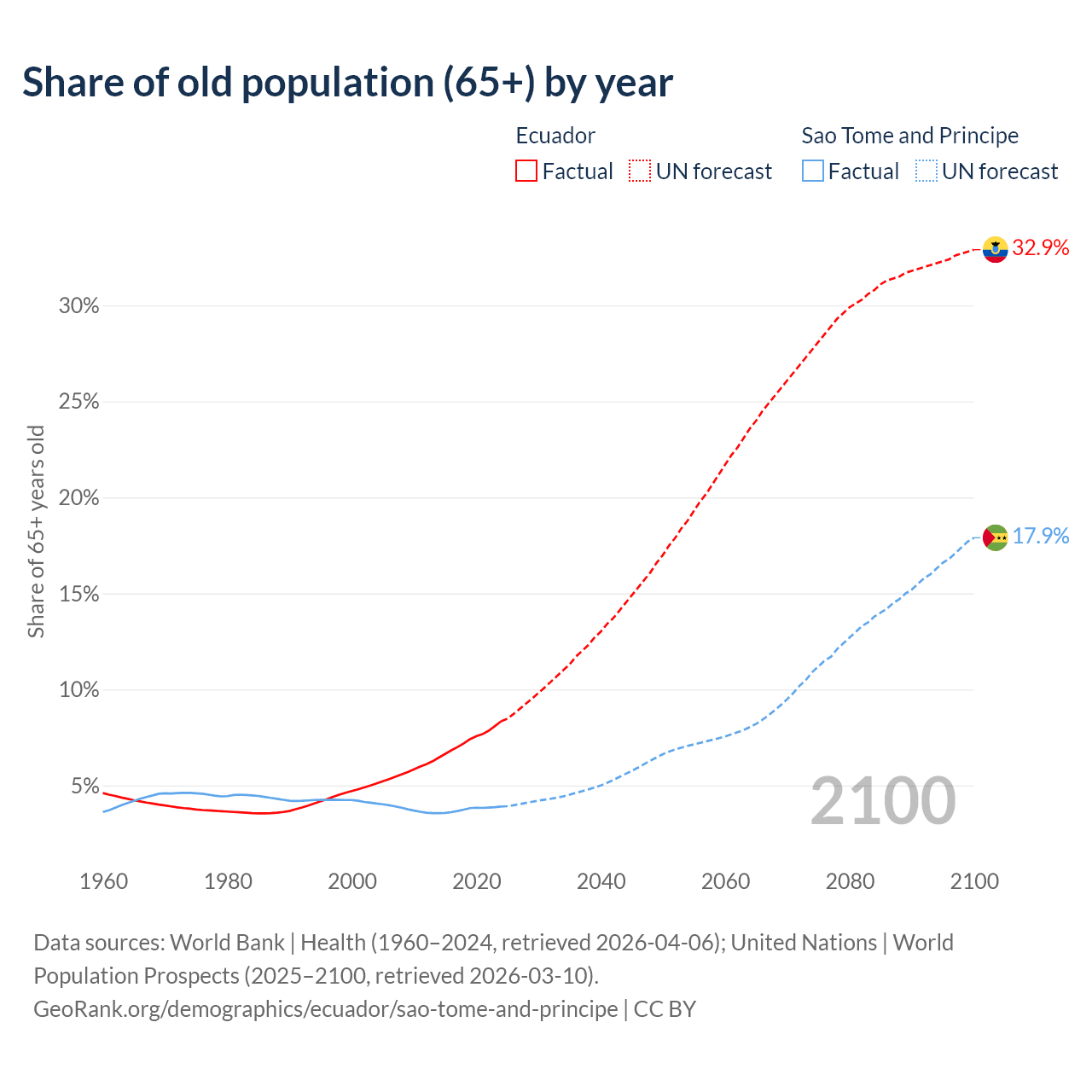 - The share of old-age demographic (65+) in Ecuador is 8.34% vs 3.9% in Sao Tome and Principe.