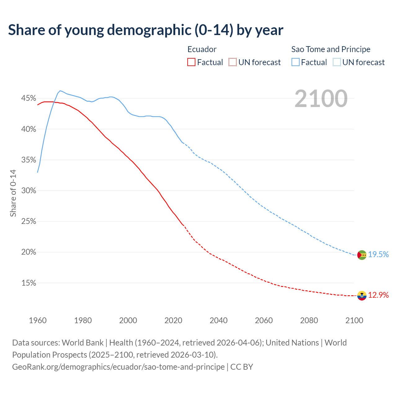 - The share of young demographic (0-15 years old) in Ecuador is 24.5% vs 37.8% in Sao Tome and Principe.