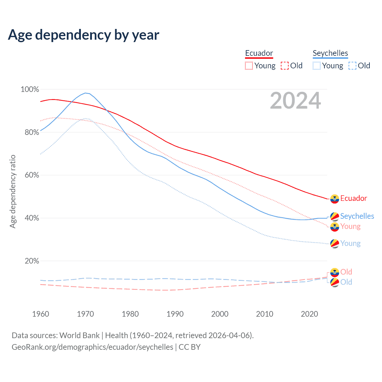 - The share of young demographic (0-15 years old) in Ecuador is 24.5% vs 20% in the Seychelles.